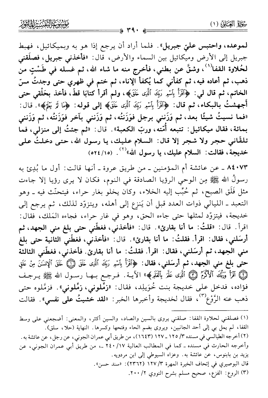 ٨٤٠٧٣ - عن عائشة أم المؤمنين -من طريق عروة- أنها قالت: أول ما بُدِئ به رسولُ الله - صلى الله عليه وسلم - مِن الوحي الرؤيا الصادقة في النوم، فكان لا يرى رؤيا إلا جاءت مثل فَلَق الصبح، ثم حُبِّب إليه الخلاء، وكان يخلو بغار حراء، فيتحنّث فيه -وهو التعبد- الليالي ذوات العدد قبل أن يَنزِع إلى أهله، ويتزوّد لذلك، ثم يرجع إلى خديجة، فيتزوّد لمثلها حتى جاءه الحق، وهو في غار حراء، فجاءه المَلك، فقال: اقرأ. قال: «قلتُ: ما أنا بقارئ». قال: «فأخذني، فغطّني حتى بلغ مني الجهد، ثم أرسَلني، فقال: اقرأ. فقلتُ: ما أنا بقارئ». قال: «فأخذني، فغطّني الثانية حتى بلغ مني الجهد، ثم أرسَلني، فقال: اقرأ. فقلتُ: ما أنا بقارئ. فأخذني، فغطّني الثالثة حتى بلغ مني الجهد، ثم أرسَلني، فقال: {اقْرَأْ بِاسْمِ رَبِّكَ الَّذِي خَلَقَ خَلَقَ الإنْسانَ مِن عَلَقٍ اقْرَأْ ورَبُّكَ الأَكْرَمُ الَّذِي عَلَّمَ بِالقَلَمِ}» الآية. فرجع بها رسول الله - صلى الله عليه وسلم - يرجف فؤاده، فدخل على خديجة بنت خُوَيلِد، فقال: «زمِّلوني، زمِّلوني». فزمَّلوه حتى ذهب عنه الرَّوْع (¬٣)، فقال لخديجة وأخبرها الخبر: «لقد خشيتُ على نفسي». فقالت
