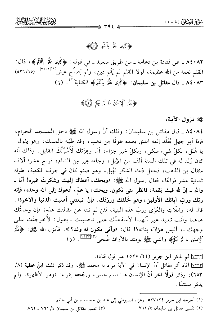 ٨٤٠٨٤ - قال مقاتل بن سليمان: وذلك أنّ رسول الله - صلى الله عليه وسلم - دخل المسجد الحرام، فإذا أبو جهل يُقَلِّد إلهه الذي يعبده طوقًا مِن ذهب، وقد طيّبه بالمسك، وهو يقول: يا هُبَل، لكلّ شيء سكن، ولكلّ خير جزاء، أما وعِزّتك لَأَسُرَّنَّكَ القابل. وذلك أنه كان وُلد له في تلك السنة ألف من الإبل، وجاءه عِير مِن الشام، فربح عشرة آلاف مثقال مِن الذهب، فجعل ذلك الشكر لهُبل، وهو صنم كان في جوف الكعبة، طوله ثمانية عشر ذراعًا، فقال رسول الله - صلى الله عليه وسلم -: «ويحك، أعطاك إلهك وشكرتَ غيره! أما -واللهِ- إنّ لله فيك نِقمة، فانظر متى تكون. ويحك، يا عمّ، أدعوك إلى الله وحده، فإنه ربّك وربّ آبائك الأولين، وهو خَلقك ورزقك، فإنّ اتبعتني أصبت الدنيا والآخرة». قال له: واللّاتِ والعُزّى وربّ هذه البنية، لئن لم تنته عن مقالتك هذه؛ فإن وجدتُك هاهنا وأنت تعبد غير آلهتنا لأسفعنّك على ناصيتك -يقول: لأُخرجنّك على وجهك-، أليس هؤلاء بناته؟! قال: «وأنى يكون له ولد؟!». فأنزل الله - عز وجل -: {عَلَّمَ الإنْسانَ ما لَمْ يَعْلَمْ} والنبي - صلى الله عليه وسلم - يومئذ بالأراك ضُحى (¬٣) [٧٢٣٣]. (ز)