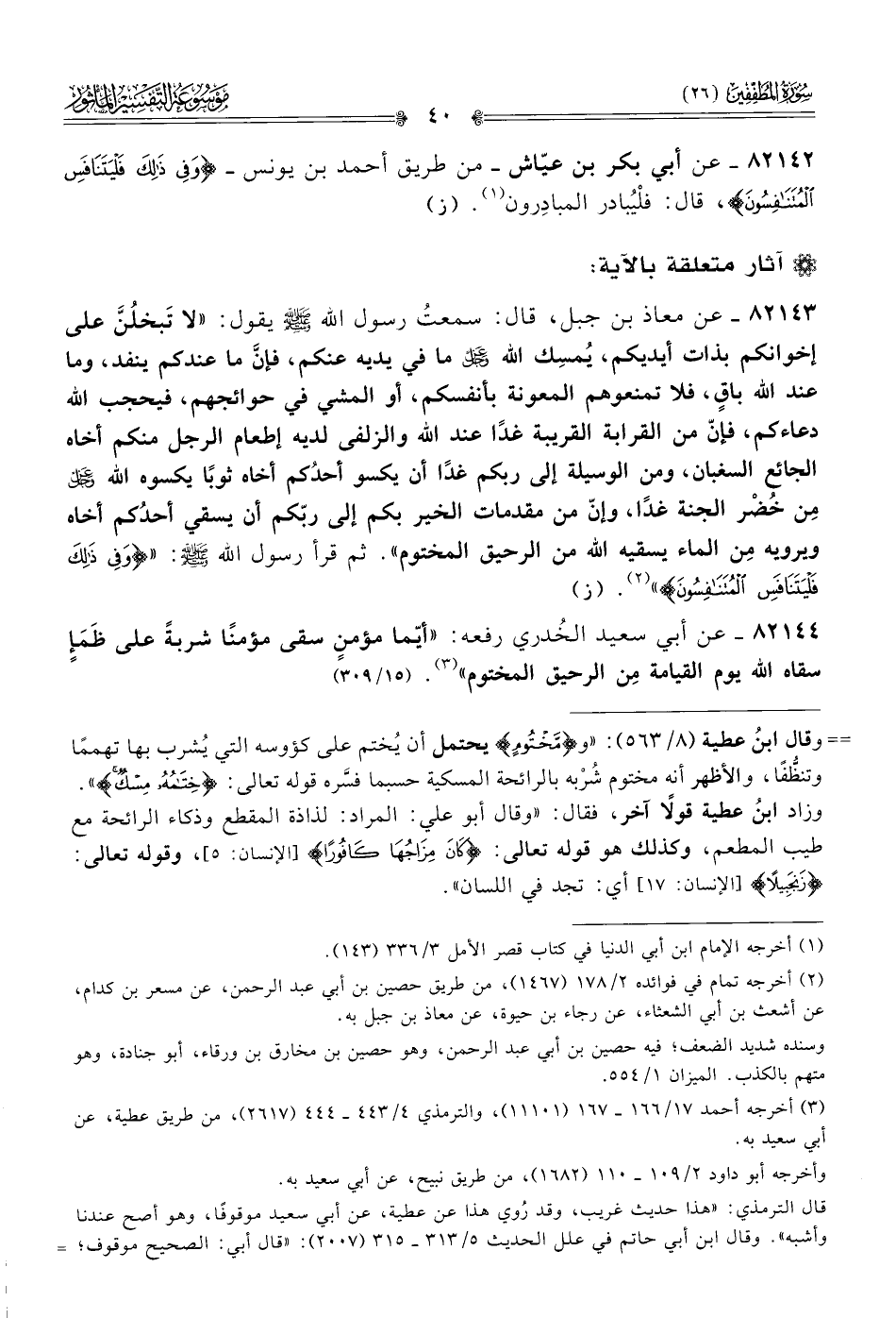 ٨٢١٤٢ - عن أبي بكر بن عيّاش -من طريق أحمد بن يونس- {وفِي ذَلِكَ فَلْيَتَنافَسِ المُتَنافِسُونَ}، قال: فلْيُبادر المبادِرون (¬١). (ز)