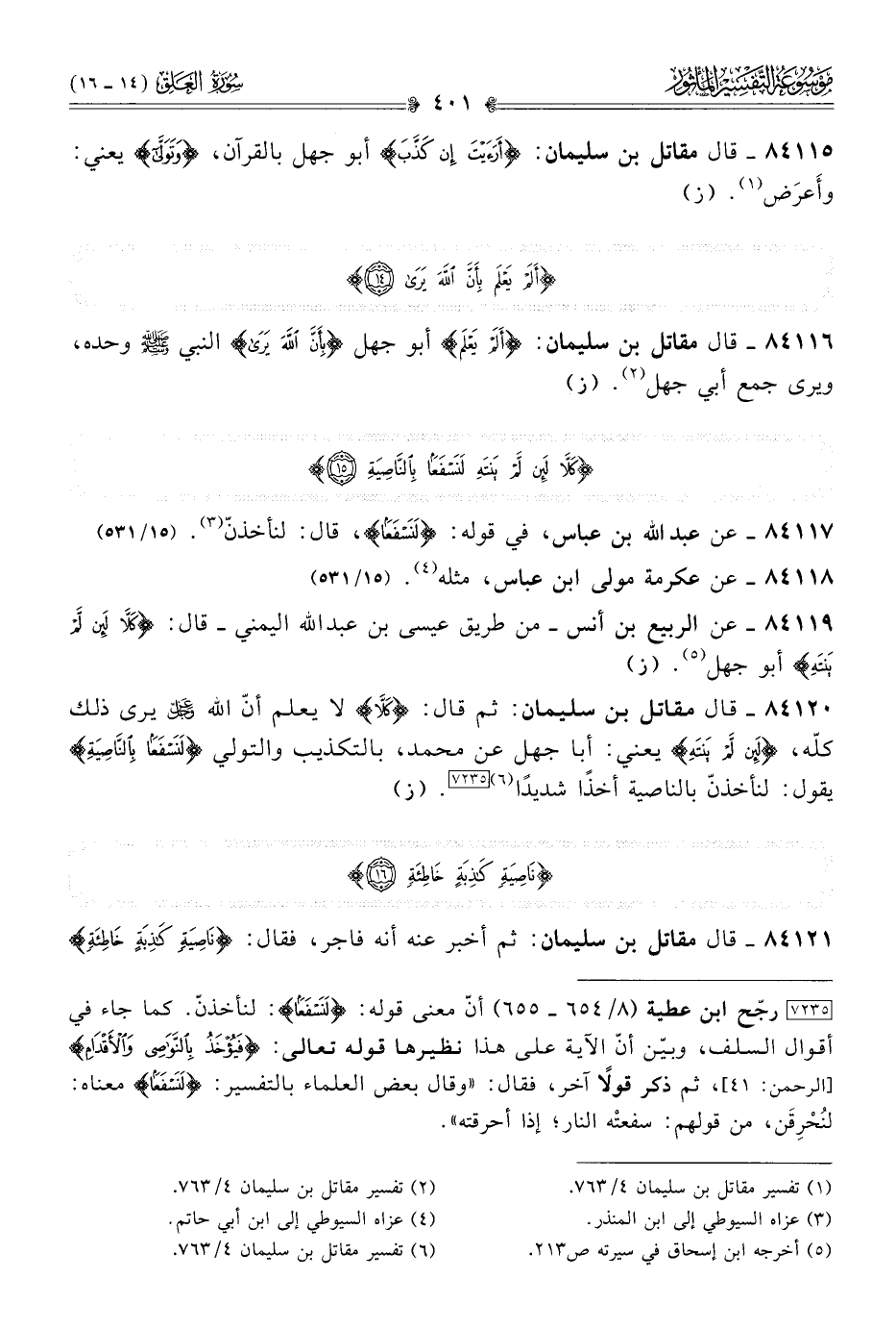 ٨٤١٢٠ - قال مقاتل بن سليمان: ثم قال: {كَلّا} لا يعلم أنّ الله - عز وجل - يرى ذلك كلّه، {لَئِنْ لَمْ يَنْتَهِ} يعني: أبا جهل عن محمد، بالتكذيب والتولي {لَنَسْفَعًا بِالنّاصِيَةِ} يقول: لنأخذنّ بالناصية أخذًا شديدًا (¬٦) [٧٢٣٥]. (ز)
