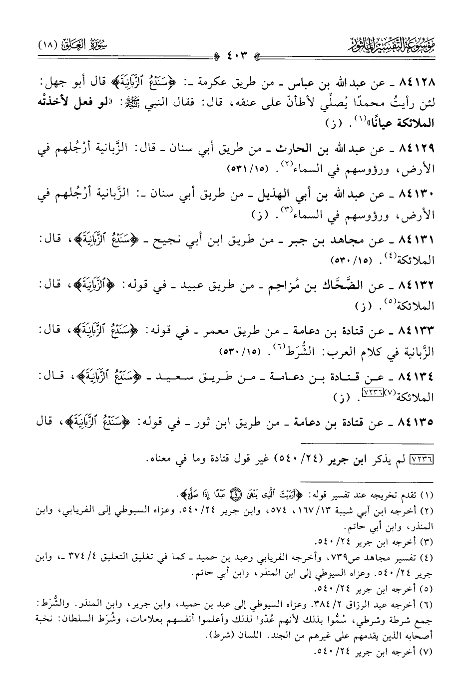 ٨٤١٢٨ - عن عبد الله بن عباس -من طريق عكرمة-: {سَنَدْعُ الزَّبانِيَةَ} قال أبو جهل: لئن رأيتُ محمدًا يُصلِّي لأطأنّ على عنقه، قال: فقال النبي - صلى الله عليه وسلم -: «لو فعل لأخذتْه الملائكة عيانًا» (¬١). (ز)