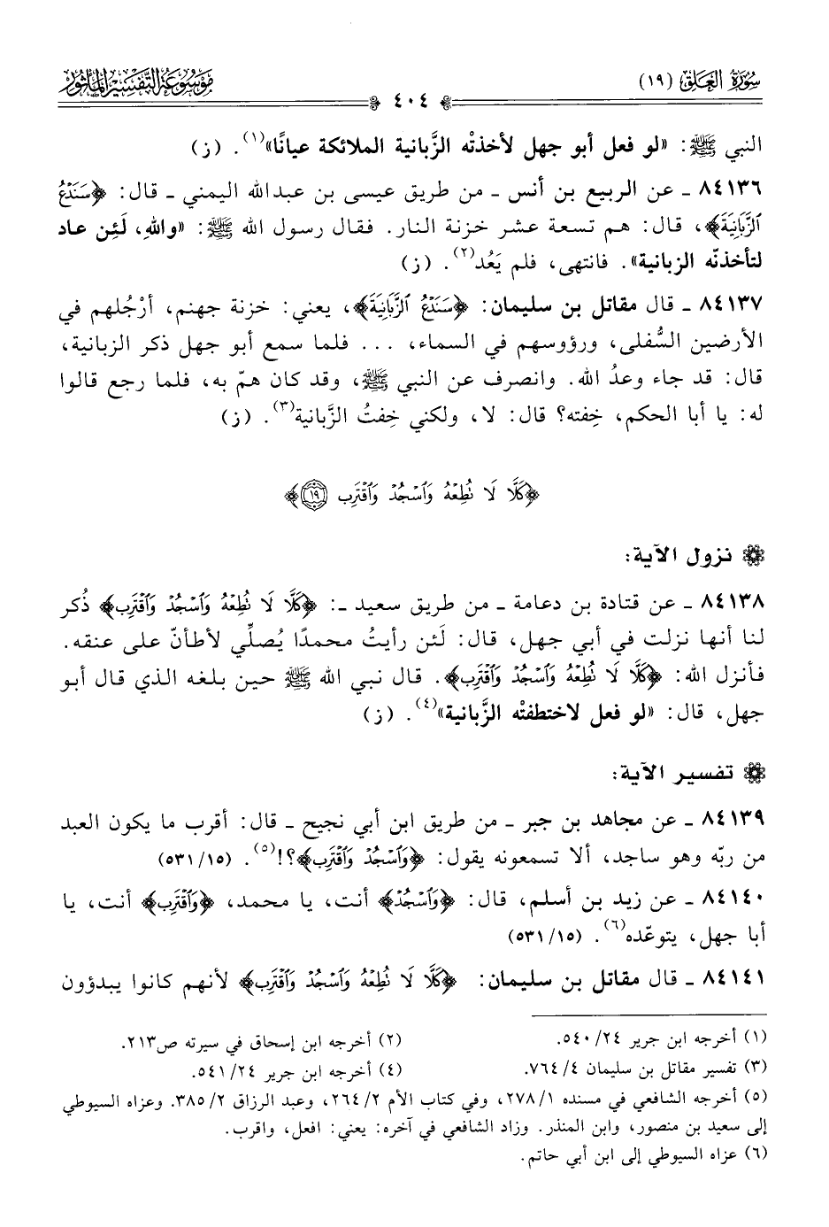 ٨٤١٣٨ - عن قتادة بن دعامة -من طريق سعيد-: {كَلّا لا تُطِعْهُ واسْجُدْ واقْتَرِبْ} ذُكر لنا أنها نزلت في أبي جهل، قال: لَئن رأيتُ محمدًا يُصلِّي لأطأنّ على عنقه. فأنزل الله: {كَلّا لا تُطِعْهُ واسْجُدْ واقْتَرِبْ}. قال نبي الله - صلى الله عليه وسلم - حين بلغه الذي قال أبو جهل، قال: «لو فعل لاختطفتْه الزَّبانية» (¬٤). (ز)