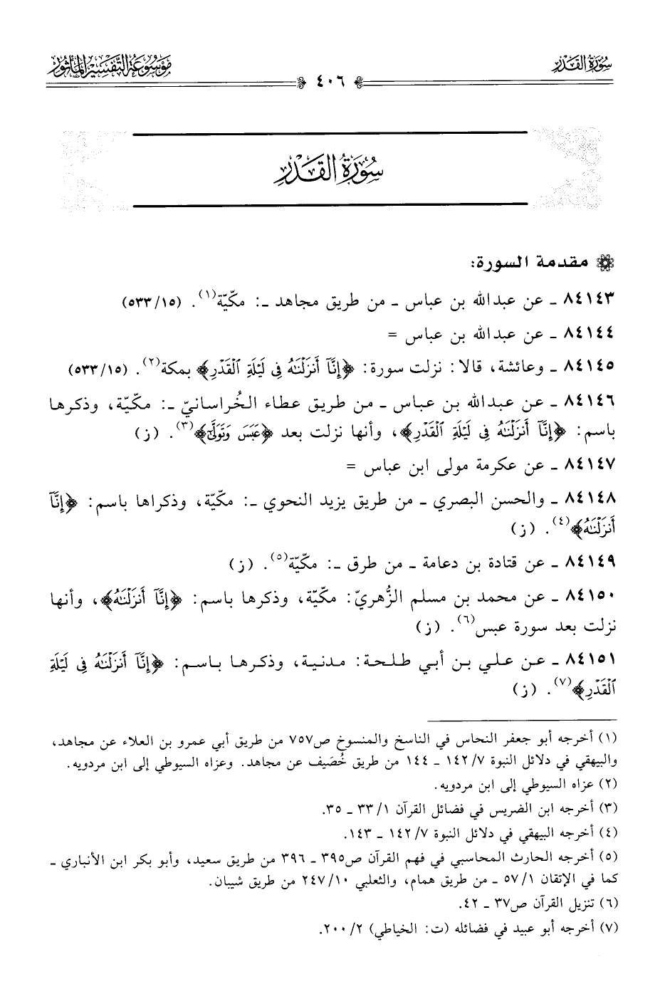 ٨٤١٤٦ - عن عبد الله بن عباس -من طريق عطاء الخُراسانيّ-: مكّيّة، وذكرها بمسمّى: {إنا أنزلناه في ليلة القدر}، وأنها نزلت بعد {عبس وتولى} (¬٣). (ز)
