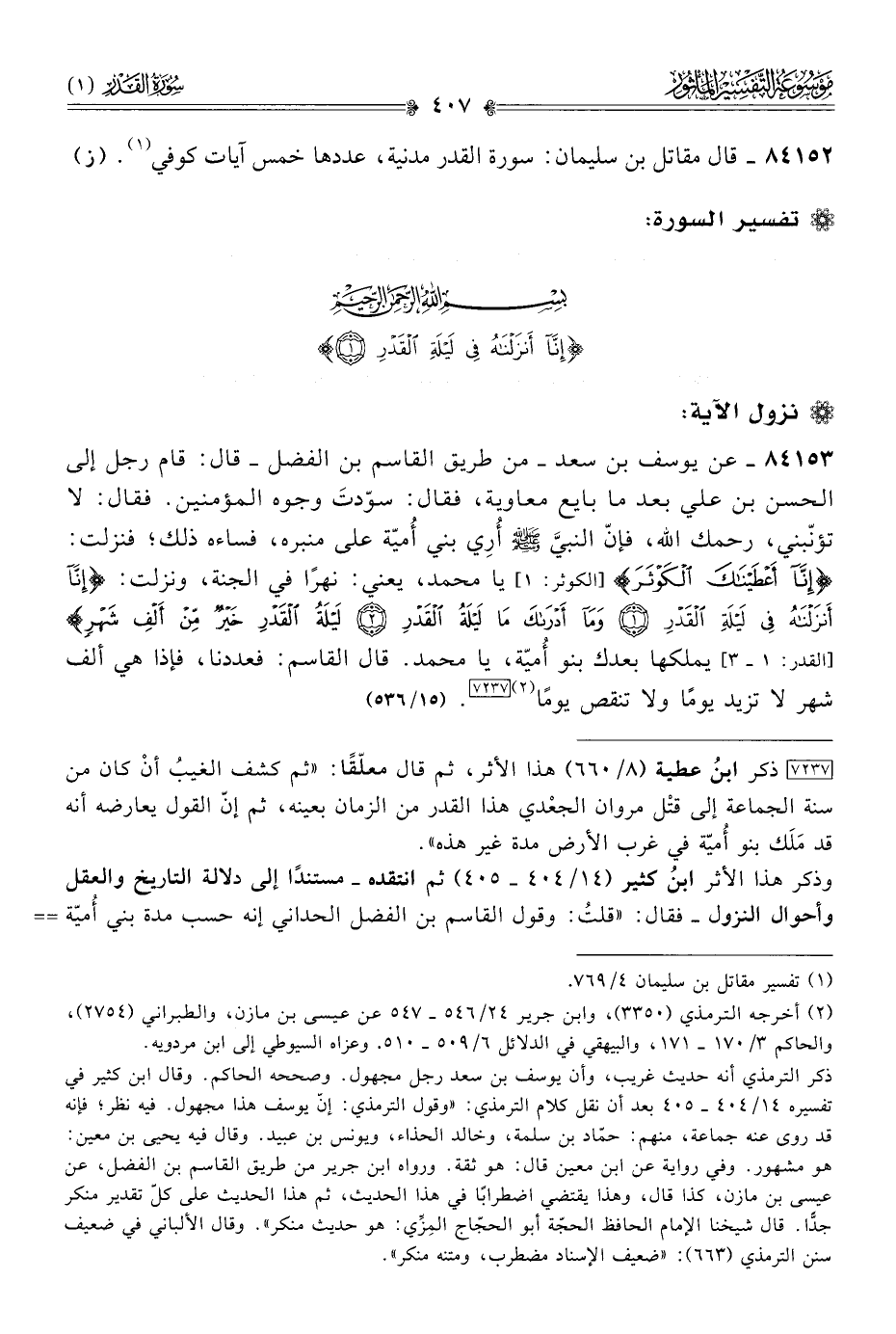 وذكر هذا الأثر ابنُ كثير (١٤/ ٤٠٤ - ٤٠٥) ثم انتقده -مستندًا إلى دلالة التاريخ والعقل وأحوال النزول- فقال: «قلتُ: وقول القاسم بن الفضل الحداني إنه حسب مدة بني أُميّة فوجدها ألف شهر لا تزيد يومًا ولا تنقص، ليس بصحيح؛ فإنّ معاوية بن أبي سفيان? استقلّ بالمُلك حين سَلّم إليه الحسن بن علي الإمرة سنة أربعين، واجتمعت البيعة لمعاوية، وسُمِّي ذلك عام الجماعة، ثم استمروا فيها متتابعين بالشام وغيرها، لم تخرج عنهم إلا مدة دولة عبد الله بن الزُّبير في الحرمين والأهواز وبعض البلاد قريبًا من تسع سنين، لكن لم تزل يدهم عن الإمرة بالكلية، بل عن بعض البلاد، إلى أن استلبهم بنو العباس الخلافة في سنة اثنتين وثلاثين ومائة، فيكون مجموع مدتهم اثنتين وتسعين سنة، وذلك أزيد من ألف شهر، فإنّ الألف شهر عبارة عن ثلاث وثمانين سنة وأربعة أشهر، وكأن القاسم بن الفضل أسقط من مدتهم أيام ابن الزُّبير، وعلى هذا فتقارب ما قاله الصحة في الحساب، والله أعلم. ومما يدل على ضعف هذا الحديث أنه سيق لذمّ دولة بني أُميّة، ولو أريد ذلك لم يكن بهذا السياق؛ فإنّ تفضيل ليلة القدر على أيامهم لا يدل على ذمّ أيامهم، فإنّ ليلة القدر شريفة جدًّا، والسورة الكريمة إنما جاءتْ لمدح ليلة القدر، فكيف تُمدح بتفضيلها على أيام بني أُميّة التي هي مذمومة بمقتضى هذا الحديث. ثم الذي يُفهم من ولاية الألف شهر المذكورة في الآية هي أيام بني أُميّة، والسورة مكّيّة، فكيف يحال على ألف شهر هي دولة بني أُميّة، ولا يدل عليها لفظ الآية ولا معناها؟! والمنبر إنما صُنع بالمدينة بعد مدة من الهجرة، فهذا كلّه مما يدل على ضعف هذا الحديث ونكارته».