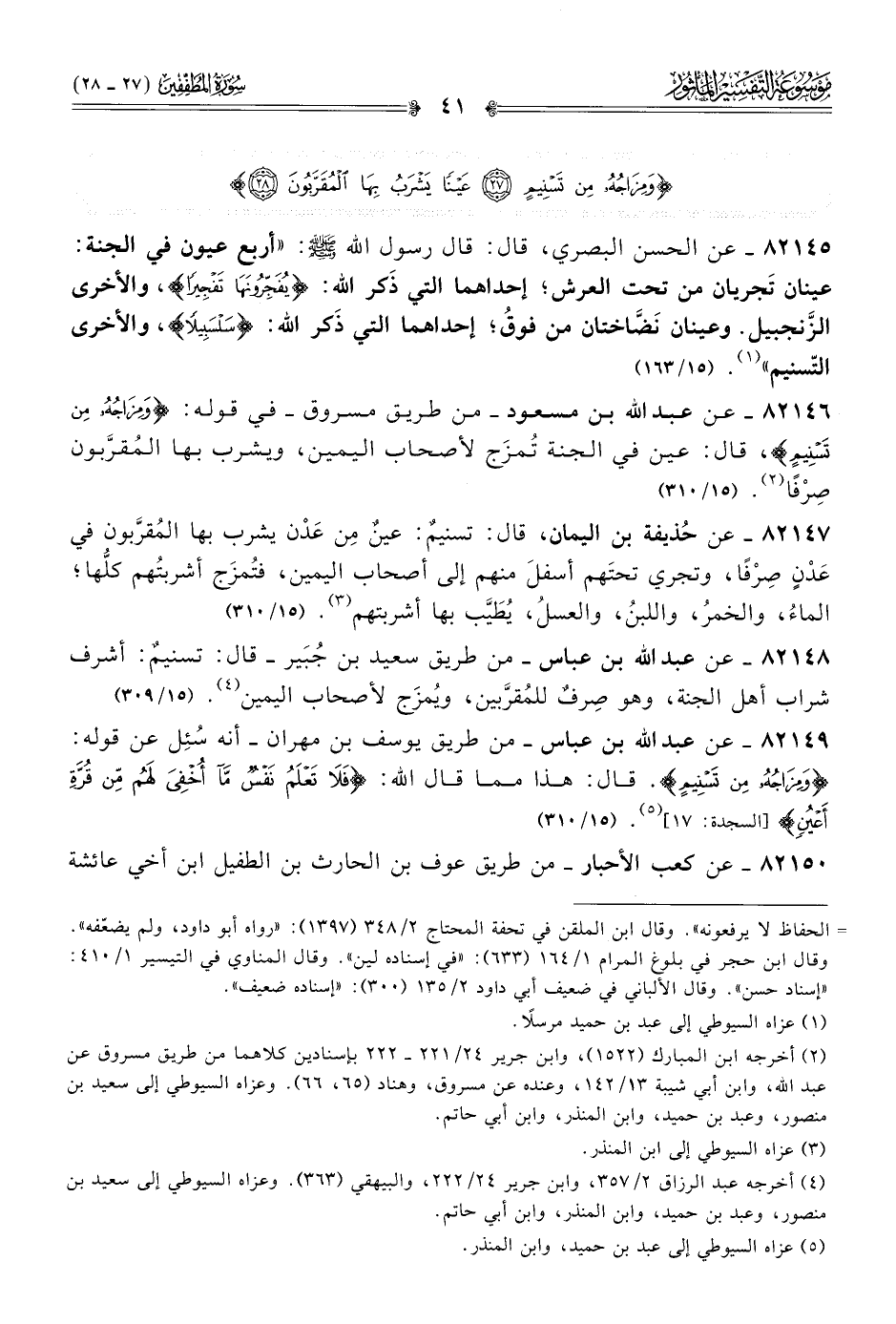 ٨٢١٤٥ - عن الحسن البصري، قال: قال رسول الله - صلى الله عليه وسلم -: «أربع عيون في الجنة: عينان تَجريان من تحت العرش؛ إحداهما التي ذَكر الله: {يُفَجِّرُونَها تَفْجِيرًا}، والأخرى الزَّنجبيل. وعينان نَضّاختان من فوقُ؛ إحداهما التي ذَكر الله: {سَلْسَبِيلًا}، والأخرى التّسنيم» (¬١). (١٥/ ١٦٣)