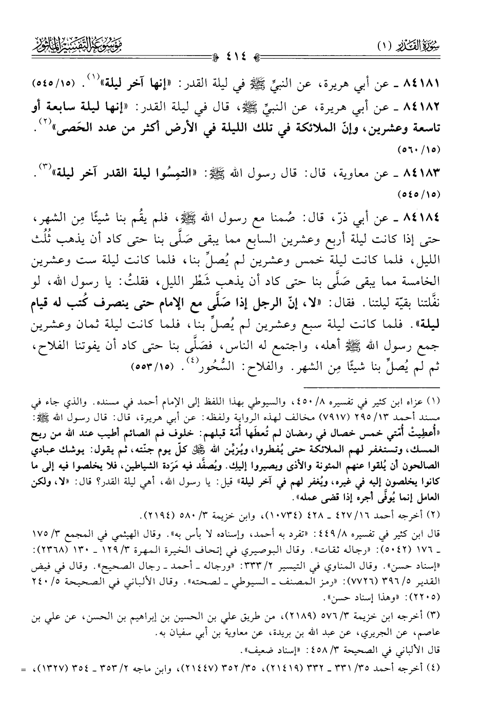 ٨٤١٨٣ - عن معاوية، قال: قال رسول الله - صلى الله عليه وسلم -: «التمِسُوا ليلة القدر آخر ليلة» (¬٣). (١٥/ ٥٤٥)