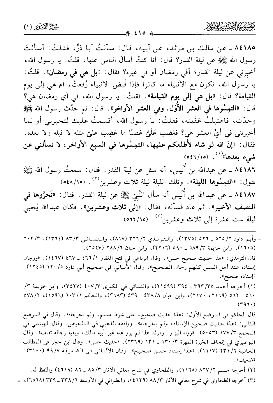 ٨٤١٨٦ - عن عبد الله بن أُنَيس، أنه سئل عن ليلة القدر. فقال: سمعتُ رسول الله - صلى الله عليه وسلم - يقول: «التمِسُوها الليلة». وتلك الليلة ليلة ثلاث وعشرين (¬٢). (١٥/ ٥٤٨)