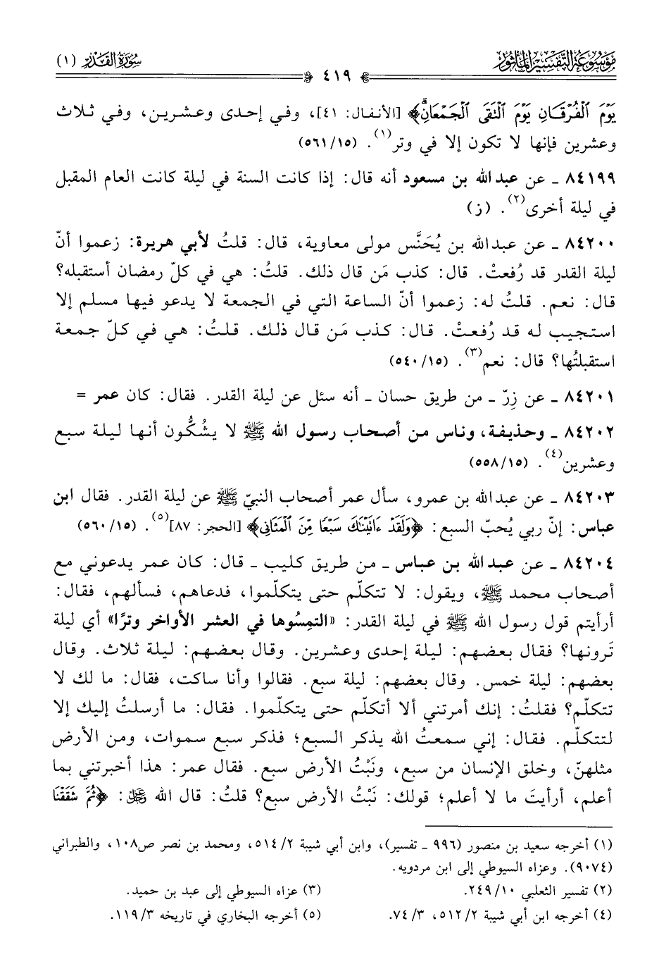 ٨٤٢٠٣ - عن عبد الله بن عمرو، سأل عمر أصحاب النبيّ - صلى الله عليه وسلم - عن ليلة القدر. فقال ابن عباس: إنّ ربي يُحبّ السبع: {ولَقَدْ آتَيْناكَ سَبْعًا مِنَ المَثانِي} [الحجر: ٨٧] (¬٥). (١٥/ ٥٦٠)