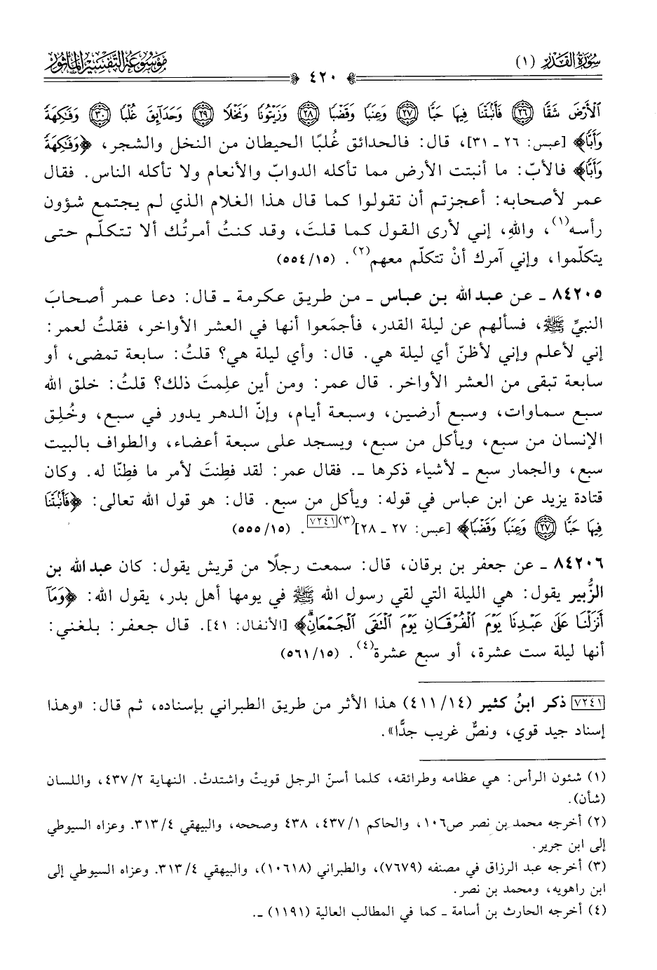 الأَرْضَ شَقًّا فَأَنْبَتْنا فِيها حَبًّا وعِنَبًا وقَضْبًا وزَيْتُونًا ونَخْلًا وحَدائِقَ غُلْبًا وفاكِهَةً وأَبًّا} [عبس: ٢٦ - ٣١]، قال: فالحدائق غُلبًا الحيطان من النخل والشجر، {وفاكِهَةً وأَبًّا} فالأبّ: ما أنبتت الأرض مما تأكله الدوابّ والأنعام ولا تأكله الناس. فقال عمر لأصحابه: أعجزتم أن تقولوا كما قال هذا الغلام الذي لم يجتمع شؤون رأسه (¬١)، واللهِ، إني لأرى القول كما قلتَ، وقد كنتُ أمرتُك ألا تتكلّم حتى يتكلّموا، وإني آمرك أنْ تتكلّم معهم (¬٢). (١٥/ ٥٥٤)