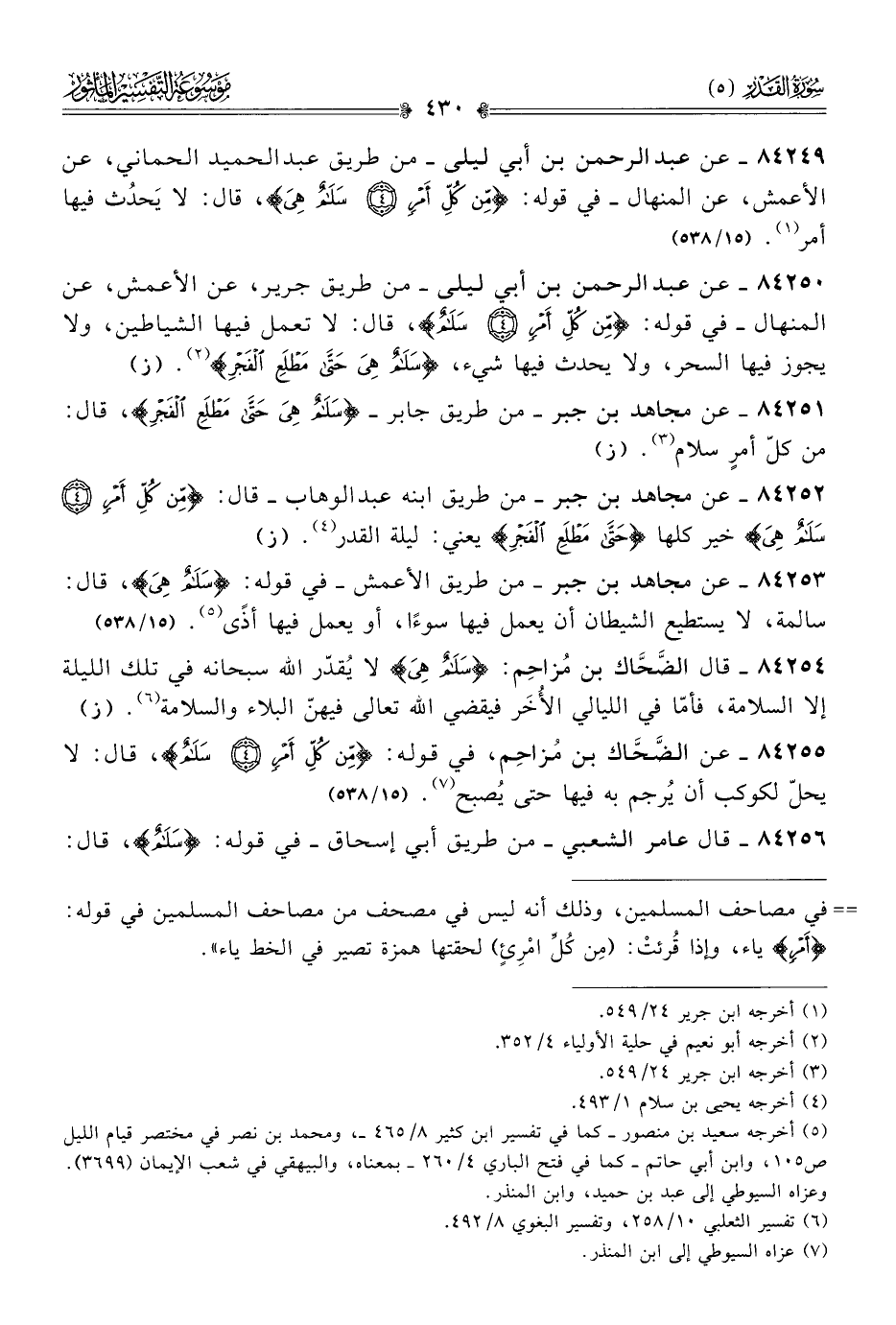 ٨٤٢٥٥ - عن الضَّحّاك بن مُزاحِم، في قوله: {مِن كُلِّ أمْرٍ * سَلامٌ}، قال: لا يحلّ لكوكب أن يُرجم به فيها حتى يُصبح (¬٧). (١٥/ ٥٣٨)