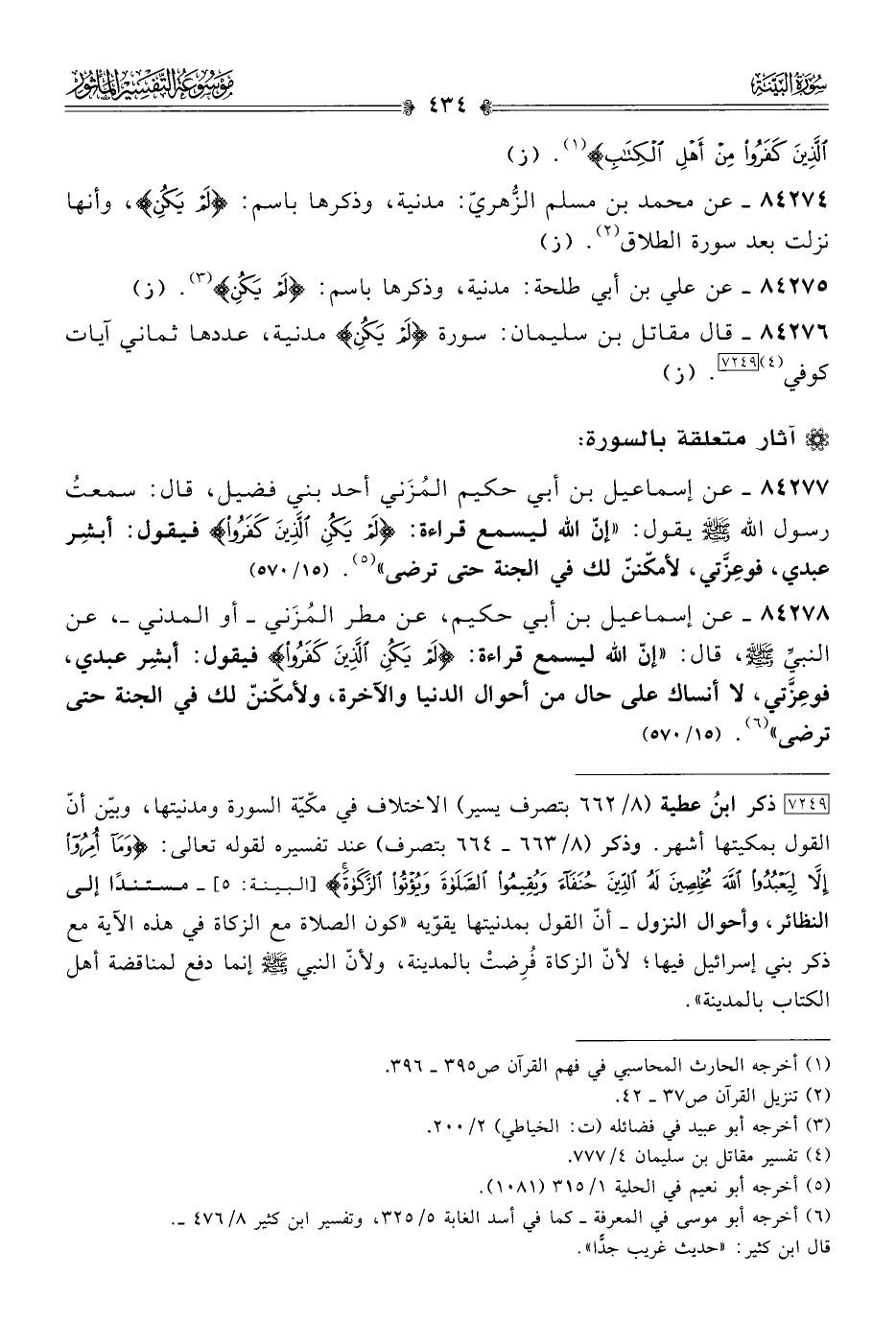 ٨٤٢٧٦ - قال مقاتل بن سليمان: سورة {لم يكن} مدنية، عددها ثماني آيات كوفي (¬٤) [٧٢٤٩]. (ز)