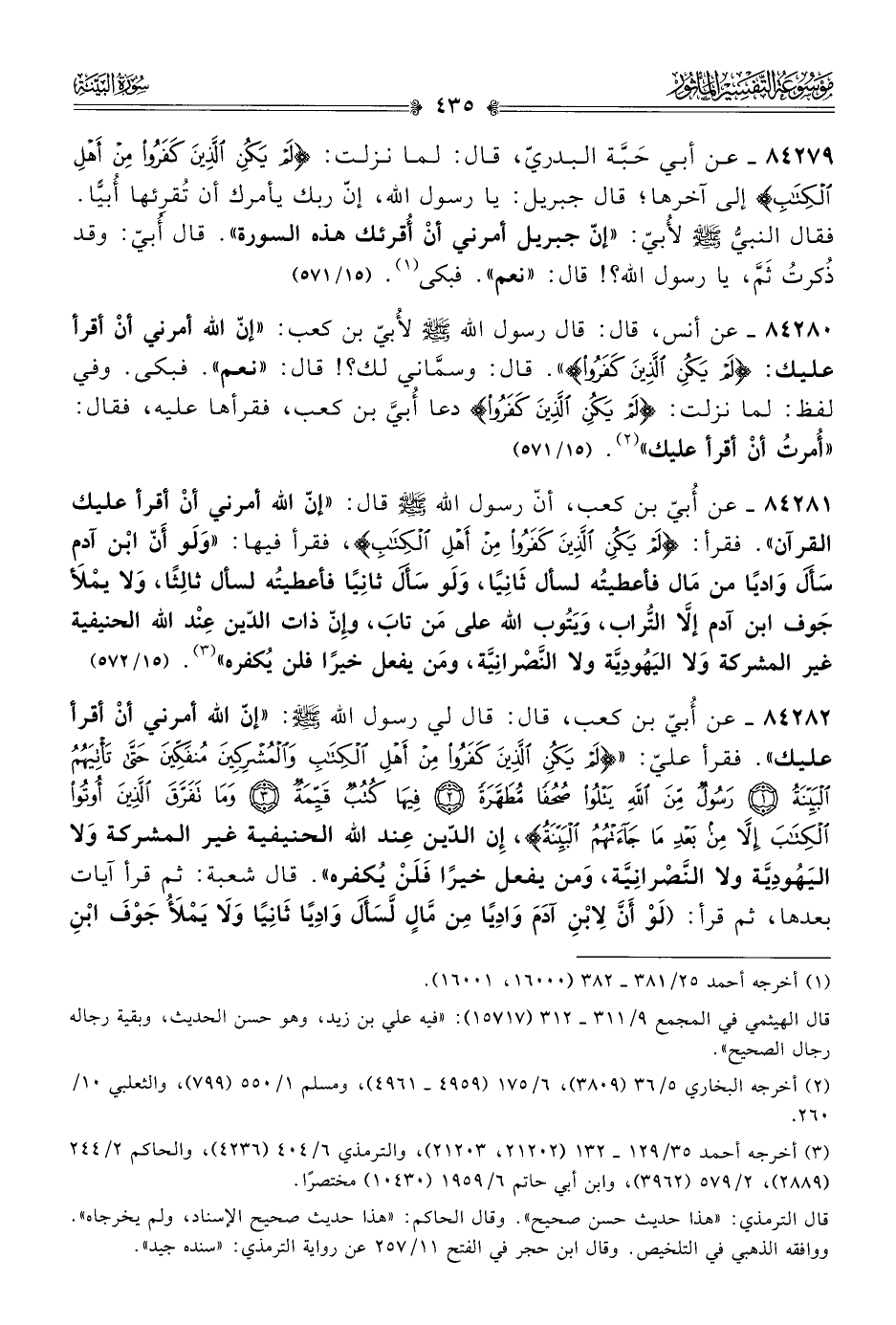 ٨٤٢٨٠ - عن أنس، قال: قال رسول الله - صلى الله عليه وسلم - لأُبيّ بن كعب: «إنّ الله أمرني أنْ أقرأ عليك: {لَمْ يَكُنِ الَّذِينَ كَفَرُوا}». قال: وسمّاني لك؟! قال: «نعم». فبكى. وفي لفظ: لما نزلت: {لَمْ يَكُنِ الَّذِينَ كَفَرُوا} دعا أُبيَّ بن كعب، فقرأها عليه، فقال: «أُمرتُ أنْ أقرأ عليك» (¬٢). (١٥/ ٥٧١)