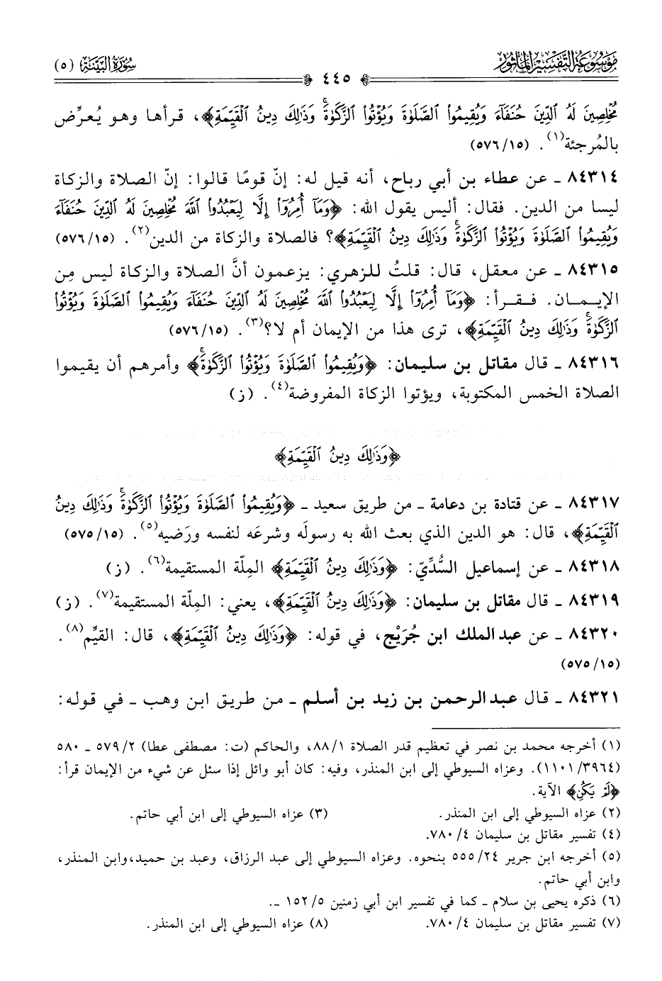 ٨٤٣١٩ - قال مقاتل بن سليمان: {وذَلِكَ دِينُ القَيِّمَةِ}، يعني: المِلّة المستقيمة (¬٧). (ز)