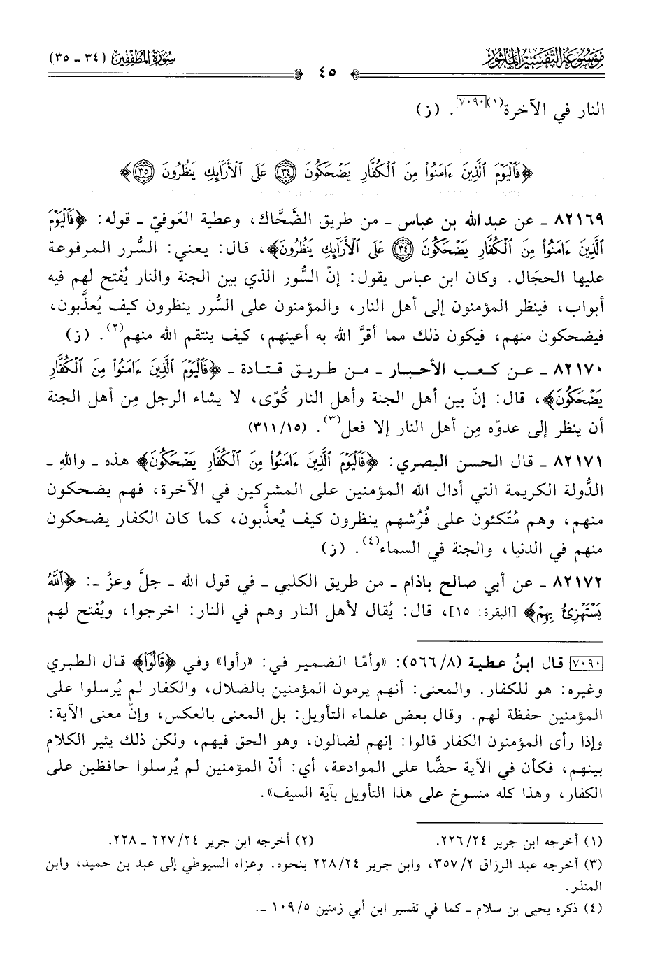 ٨٢١٦٩ - عن عبد الله بن عباس -من طريق الضَّحّاك، وعطية العَوفيّ- قوله: {فاليَوْمَ الَّذِينَ آمَنُوا مِنَ الكُفّارِ يَضْحَكُونَ عَلى الأَرائِكِ يَنْظُرُونَ}، قال: يعني: السُّرر المرفوعة عليها الحجال. وكان ابن عباس يقول: إنّ السُّور الذي بين الجنة والنار يُفتح لهم فيه أبواب، فينظر المؤمنون إلى أهل النار، والمؤمنون على السُّرر ينظرون كيف يُعذَّبون، فيضحكون منهم، فيكون ذلك مما أقرَّ الله به أعينهم، كيف ينتقم الله منهم (¬٢). (ز)