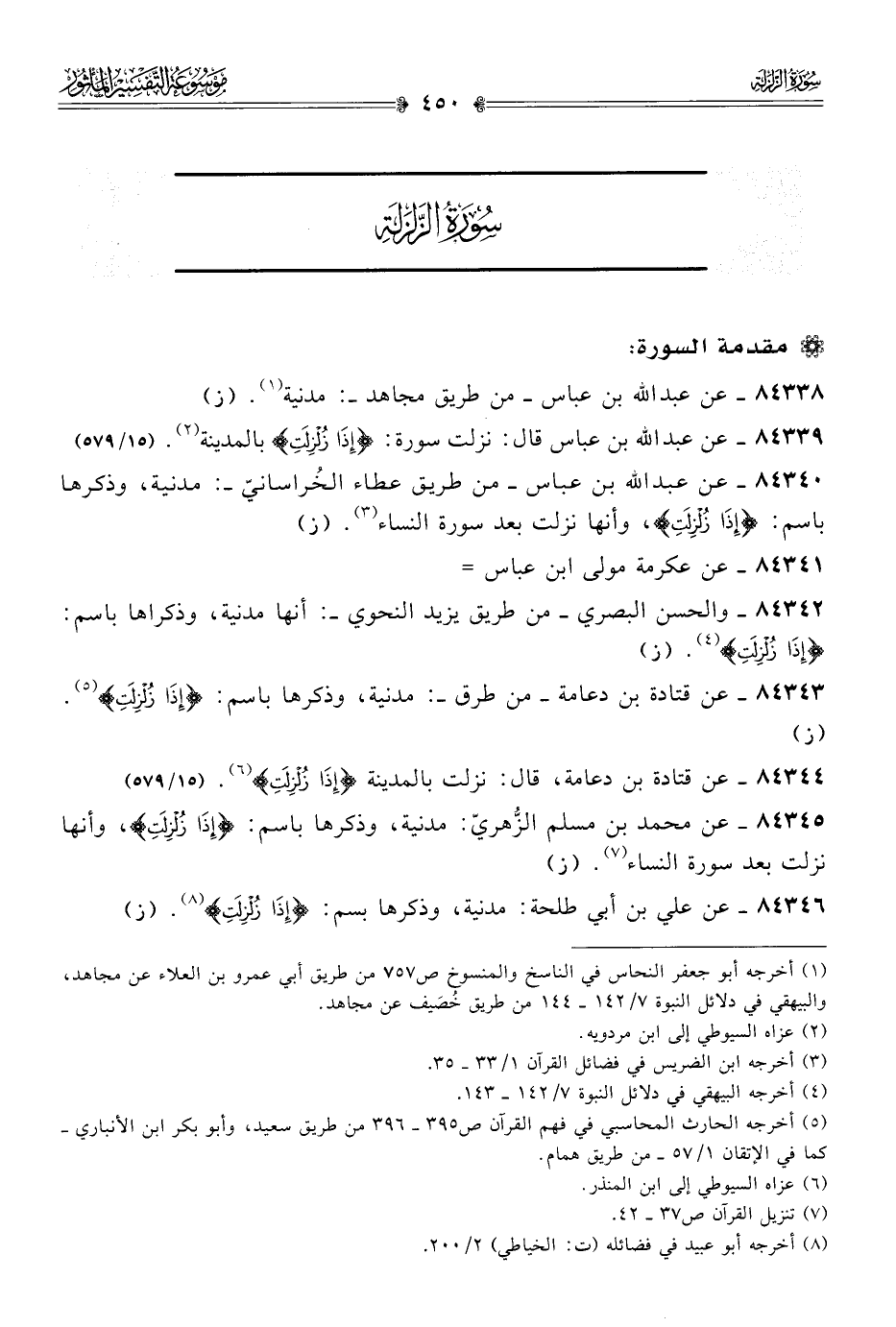 ٨٤٣٤٠ - عن عبد الله بن عباس -من طريق عطاء الخُراسانيّ-: مدنية، وذكرها بمسمّى: {إذا زلزلت}، وأنها نزلت بعد سورة النساء (¬٣). (ز)