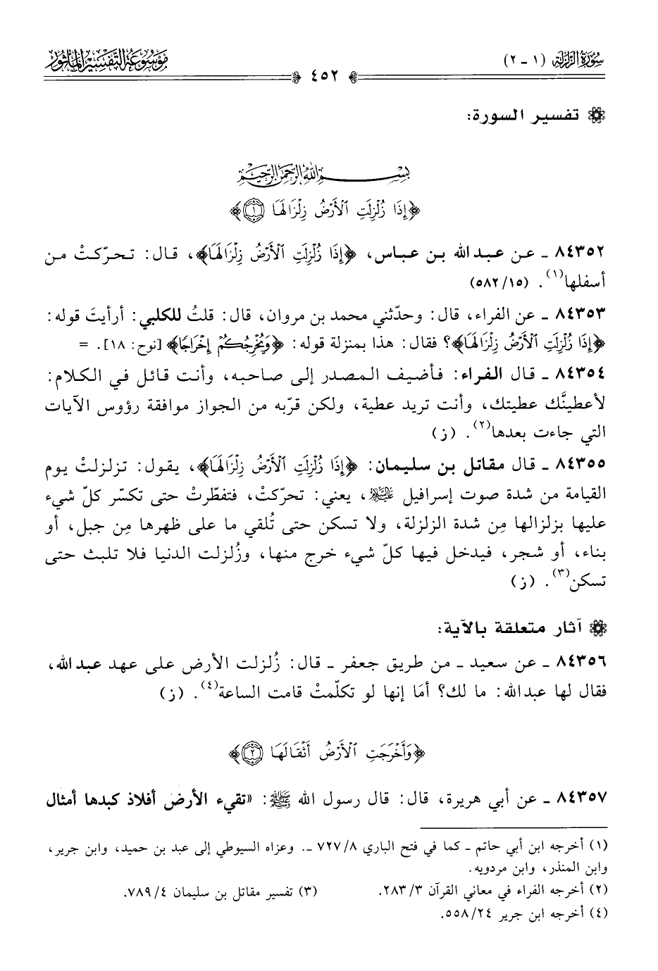 ٨٤٣٥٢ - عن عبد الله بن عباس، {إذا زُلْزِلَتِ الأَرْضُ زِلْزالَها}، قال: تحرّكتْ من أسفلها (¬١). (١٥/ ٥٨٢)