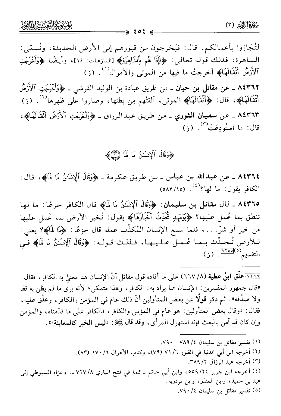 ٨٤٣٦٥ - قال مقاتل بن سليمان: {وقالَ الإنْسانُ ما لَها} قال الكافر جزعًا: ما لها تنطق بما عُمل عليها؟ {يَوْمَئِذٍ تُحَدِّثُ أخْبارَها} يقول: تُخبر الأرض بما عُمل عليها من خير أو شرّ ... ، فلما سمع الإنسان المُكذّب عمله قال جزعًا: {ما لَها}؟ يعني: للأرض تُحدِّث بما عُمل عليها، فذلك قوله: {وقالَ الإنْسانُ ما لَها} في التقديم (¬٥) [٧٢٥٥]. (ز)