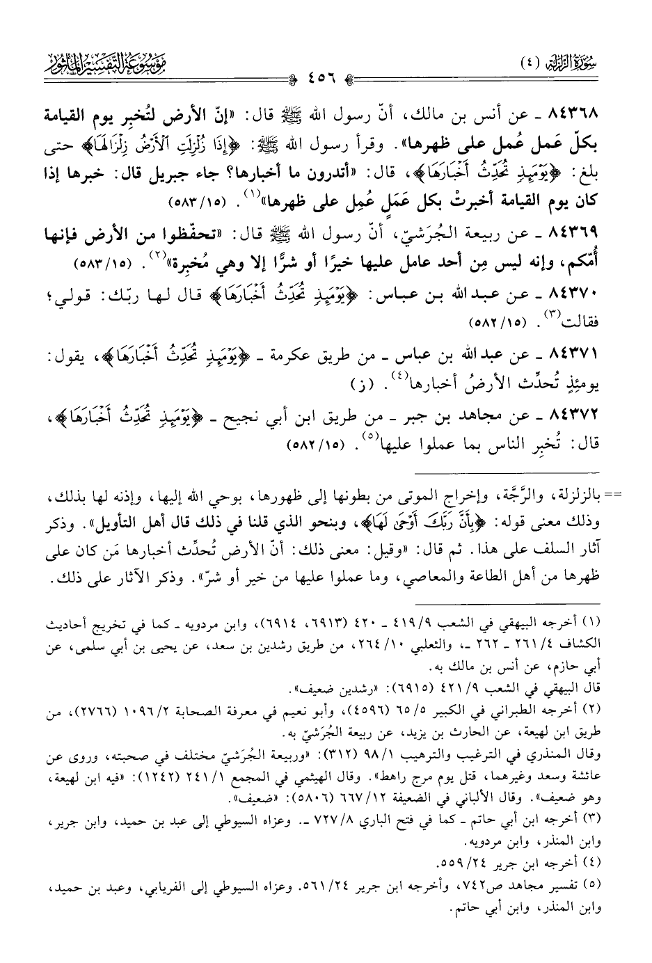 ٨٤٣٦٨ - عن أنس بن مالك، أنّ رسول الله - صلى الله عليه وسلم - قال: «إنّ الأرض لتُخبِر يوم القيامة بكلّ عَمل عُمل على ظهرها». وقرأ رسول الله - صلى الله عليه وسلم -: {إذا زُلْزِلَتِ الأَرْضُ زِلْزالَها} حتى بلغ: {يَوْمَئِذٍ تُحَدِّثُ أخْبارَها}، قال: «أتدرون ما أخبارها؟ جاء جبريل قال: خبرها إذا كان يوم القيامة أخبرتْ بكل عَمَلٍ عُمِل على ظهرها» (¬١). (١٥/ ٥٨٣)