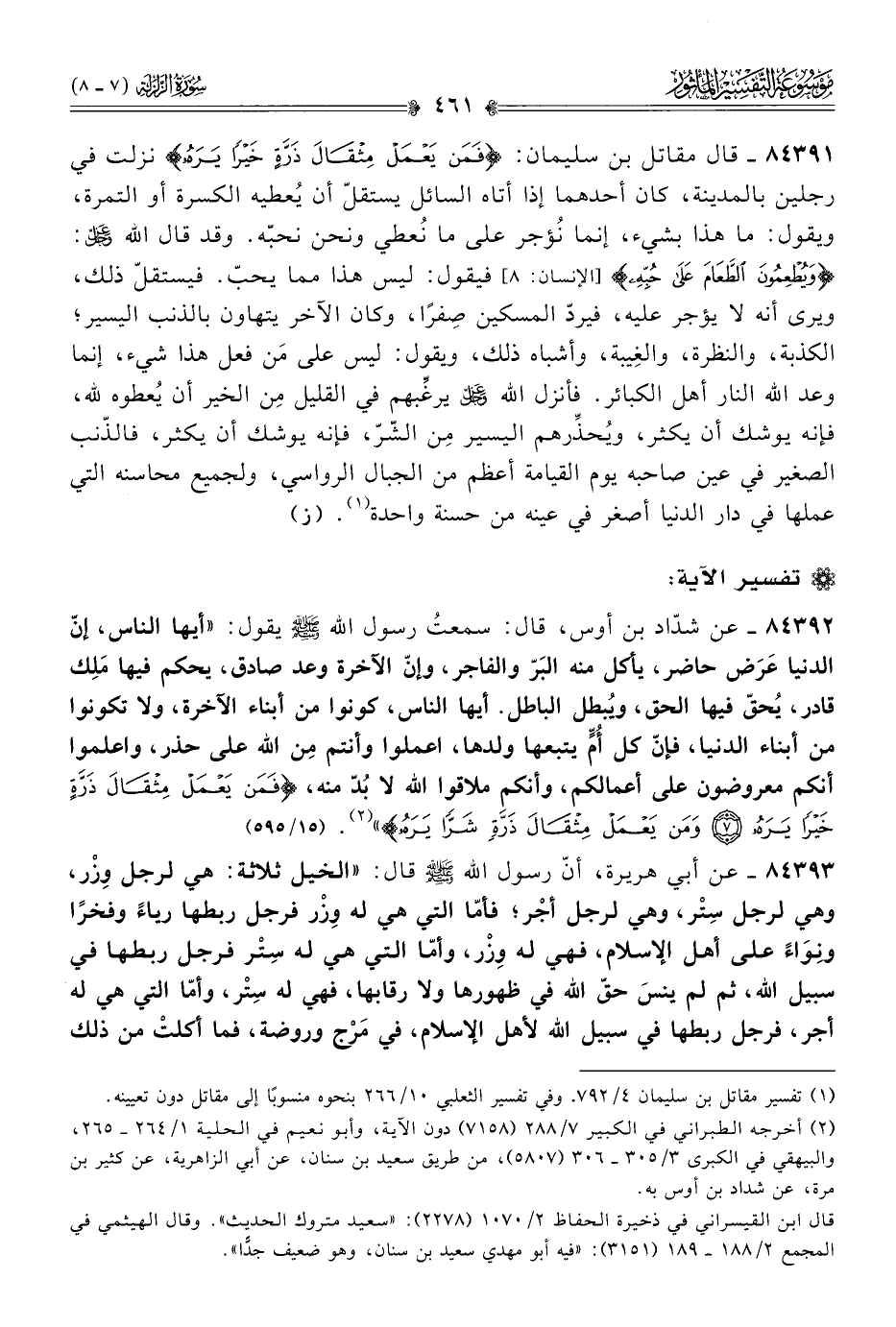 ٨٤٣٩١ - قال مقاتل بن سليمان: {فَمَن يَعْمَلْ مِثْقالَ ذَرَّةٍ خَيْرًا يَرَهُ} نزلت في رجلين بالمدينة، كان أحدهما إذا أتاه السائل يستقلّ أن يُعطيه الكسرة أو التمرة، ويقول: ما هذا بشيء، إنما نُؤجر على ما نُعطي ونحن نحبّه. وقد قال الله - عز وجل -: {ويُطْعِمُونَ الطَّعامَ عَلى حُبِّهِ} [الإنسان: ٨] فيقول: ليس هذا مما يحبّ. فيستقلّ ذلك، ويرى أنه لا يؤجر عليه، فيردّ المسكين صِفرًا، وكان الآخر يتهاون بالذنب اليسير؛ الكذبة، والنظرة، والغِيبة، وأشباه ذلك، ويقول: ليس على مَن فعل هذا شيء، إنما وعد الله النار أهل الكبائر. فأنزل الله - عز وجل - يرغِّبهم في القليل مِن الخير أن يُعطوه لله، فإنه يوشك أن يكثر، ويُحذِّرهم اليسير مِن الشّرّ، فإنه يوشك أن يكثر، فالذّنب الصغير في عين صاحبه يوم القيامة أعظم من الجبال الرواسي، ولجميع محاسنه التي عملها في دار الدنيا أصغر في عينه من حسنة واحدة (¬١). (ز)