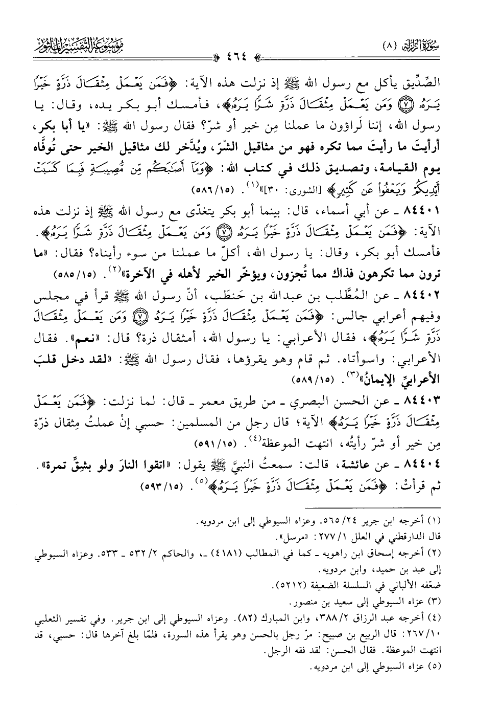 الصِّدِّيق يأكل مع رسول الله - صلى الله عليه وسلم - إذ نزلت هذه الآية: {فَمَن يَعْمَلْ مِثْقالَ ذَرَّةٍ خَيْرًا يَرَهُ ومَن يَعْمَلْ مِثْقالَ ذَرَّةٍ شَرًّا يَرَهُ}، فأمسك أبو بكر يده، وقال: يا رسول الله، إننا لَراؤون ما عملنا مِن خير أو شرّ؟ فقال رسول الله - صلى الله عليه وسلم -: «يا أبا بكر، أرأيتَ ما رأيتَ مما تكره فهو من مثاقيل الشّرّ، ويُدَّخر لك مثاقيل الخير حتى تُوفّاه يوم القيامة، وتصديق ذلك في كتاب الله: {وما أصابَكُمْ مِن مُصِيبَةٍ فَبِما كَسَبَتْ أيْدِيكُمْ ويَعْفُو عَنْ كَثِيرٍ} [الشورى: ٣٠]» (¬١). (١٥/ ٥٨٦)