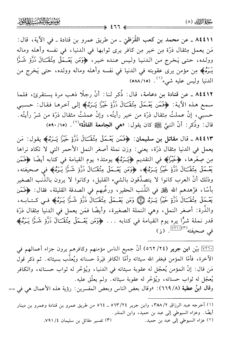 ٨٤٤١١ - عن محمد بن كعب القُرَظيّ -من طريق عمرو بن قتادة- في الآية، قال: مَن يعمل مِثقال ذرّة مِن خير مِن كافر يرى ثوابها في الدنيا، في نفسه وأهله وماله وولده، حتى يَخرج من الدنيا وليس عنده خير، {ومَن يَعْمَلْ مِثْقالَ ذَرَّةٍ شَرًّا يَرَهُ} مِن مؤمن يرى عقوبته في الدنيا في نفسه وأهله وماله وولده، حتى يَخرج من الدنيا وليس عليه شيء (¬١). (١٥/ ٥٨٨)