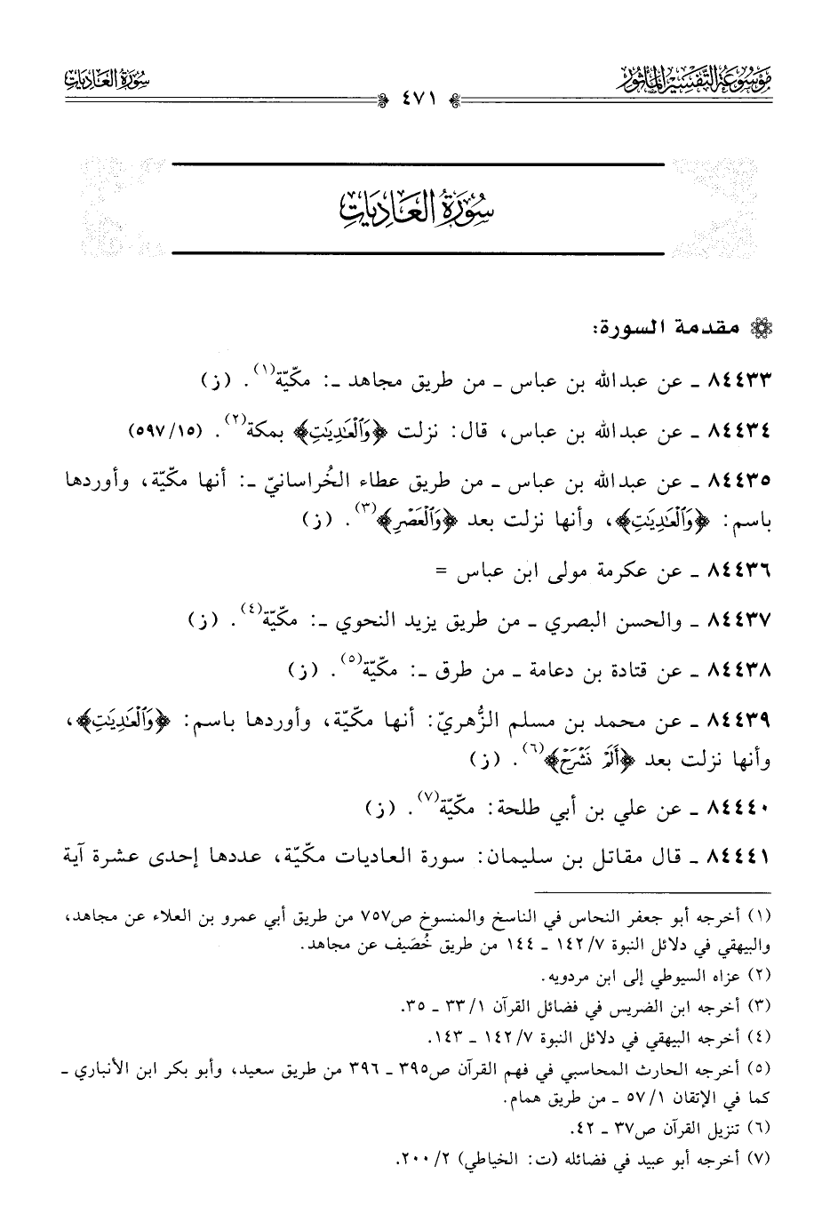 ٨٤٤٣٥ - عن عبد الله بن عباس -من طريق عطاء الخُراسانيّ-: أنها مكّيّة، وأوردها بمسمّى: {والعاديات}، وأنها نزلت بعد {والعصر} (¬٣). (ز)