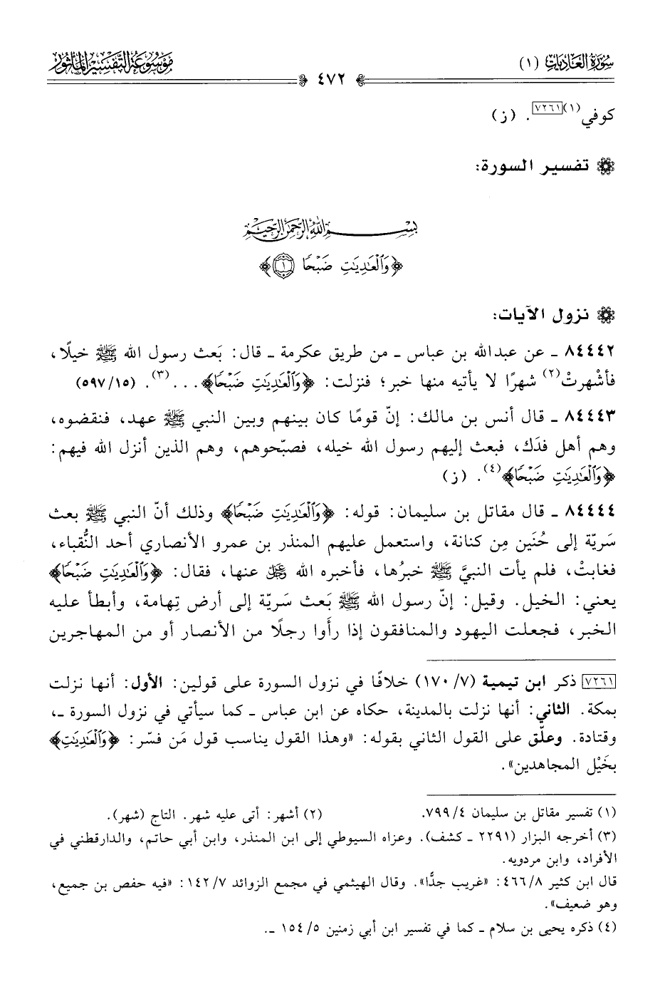 [٧٢٦١] ذكر ابن تيمية (٧/ ١٧٠) خلافًا في نزول السورة على قولين: الأول: أنها نزلت بمكة. الثاني: أنها نزلت بالمدينة، حكاه عن ابن عباس -كماسيأتي في نزول السورة-، وقتادة. وعلّق على القول الثاني بقوله: «وهذا القول يناسب قول مَن فسّر: {والعاديات} بخَيْل المجاهدين».