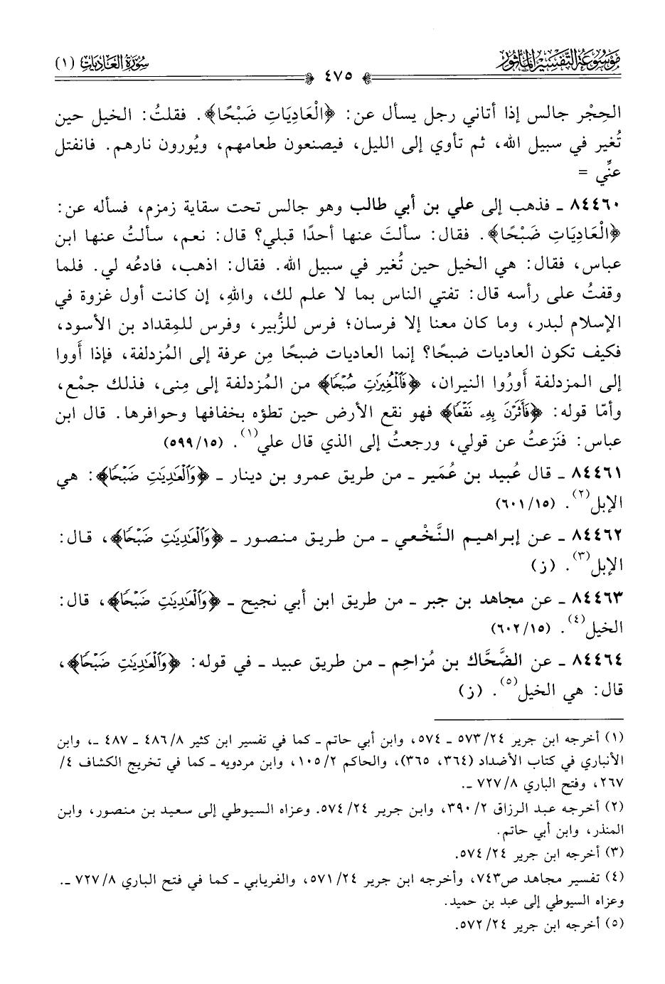 ٨٤٤٦٣ - عن مجاهد بن جبر -من طريق ابن أبي نجيح- {والعادِياتِ ضَبْحًا}، قال: الخيل (¬٤). (١٥/ ٦٠٢)