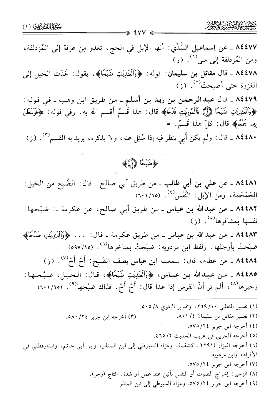 ٨٤٤٨٥ - عن عبد الله بن عباس، {والعادِياتِ ضَبْحًا}، قال: الخيل، ضبْحها: زحيرها (¬٨)، ألم تر أنّ الفرس إذا عدا قال: أحْ أحْ. فذاك ضبْحها (¬٩). (١٥/ ٦٠١)