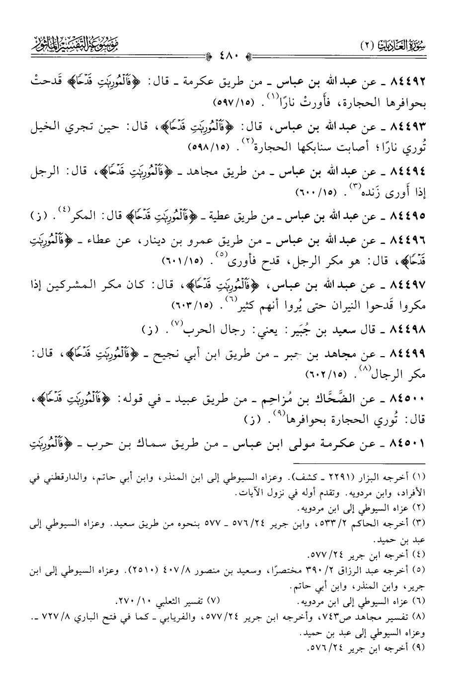 ٨٤٤٩٢ - عن عبد الله بن عباس -من طريق عكرمة- قال: {فالمُورِياتِ قَدْحًا} قَدحتْ بحوافرها الحجارة، فأَورتْ نارًا (¬١). (١٥/ ٥٩٧)
