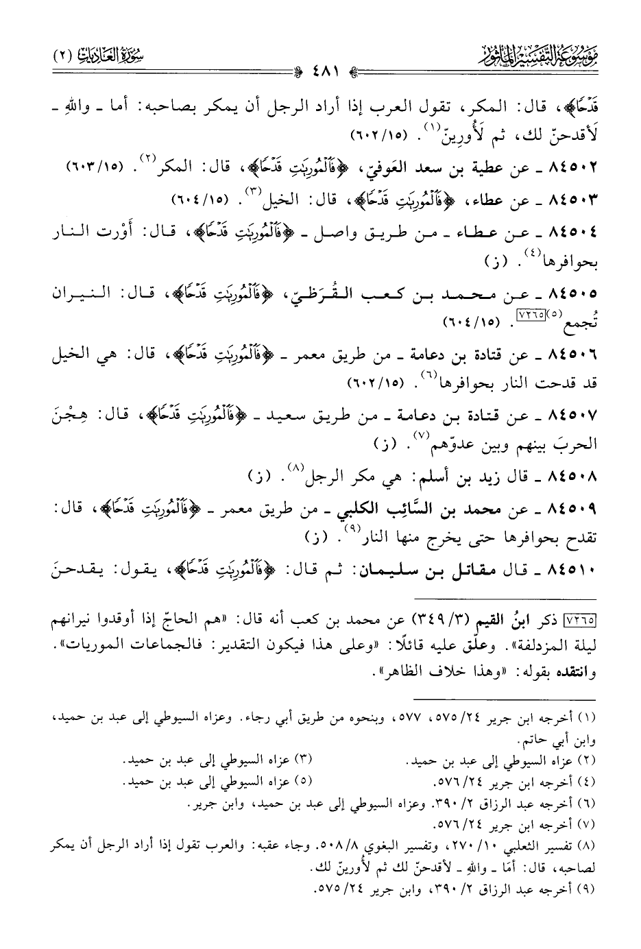 [٧٢٦٥] ذكر ابنُ القيم (٣/ ٣٤٩) عن محمد بن كعب أنه قال: «هم الحاجّ إذا أوقدوا نيرانهم ليلة المزدلفة». وعلّق عليه قائلًا: «وعلى هذا فيكون التقدير: فالجماعات الموريات». وانتقده بقوله: «وهذا خلاف الظاهر».