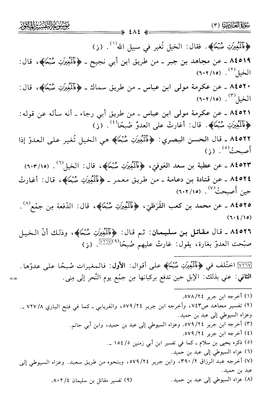 ٨٤٥٢٣ - عن عطية بن سعد العَوفيّ، {فالمُغِيراتِ صُبْحًا}، قال: الخيل (¬٦). (١٥/ ٦٠٣)