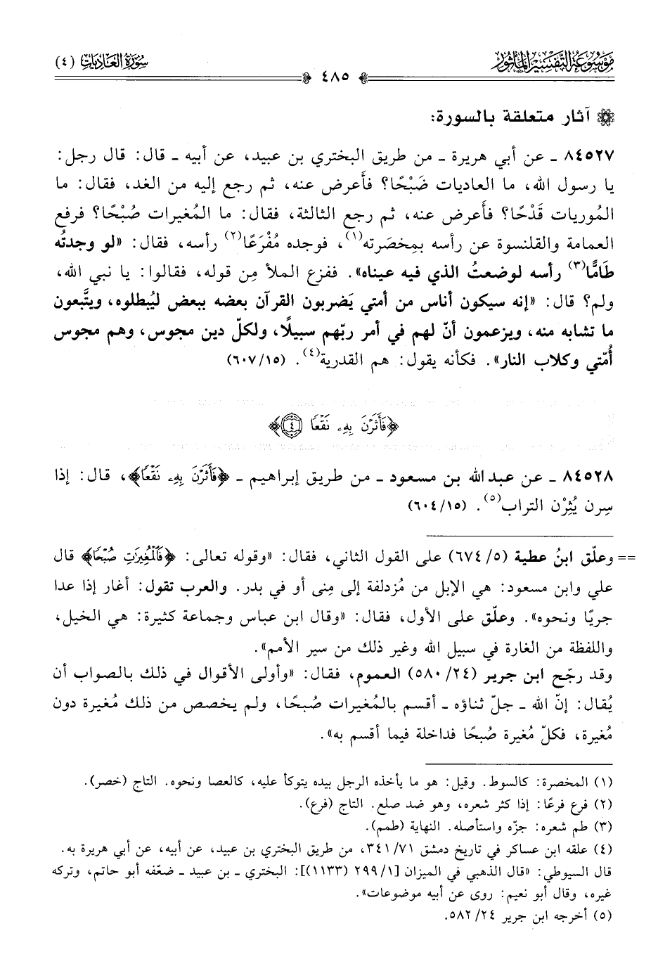 ٨٤٥٢٧ - عن أبي هريرة -من طريق البختري بن عبيد، عن أبيه- قال: قال رجل: يا رسول الله، ما العاديات ضَبْحًا؟ فأَعرض عنه، ثم رجع إليه من الغد، فقال: ما المُوريات قَدْحًا؟ فأَعرض عنه، ثم رجع الثالثة، فقال: ما المُغيرات صُبْحًا؟ فرفع العمامة والقلنسوة عن رأسه بمِخصَرته (¬١)، فوجده مُفْرَعًا (¬٢) رأسه، فقال: «لو وجدتُه طامًّا (¬٣) رأسه لوضعتُ الذي فيه عيناه». ففزع الملأ مِن قوله، فقالوا: يا نبي الله، ولم؟ قال: «إنه سيكون أناس من أمتي يَضربون القرآن بعضه ببعض ليُبطلوه، ويتَّبعون ما تشابه منه، ويزعمون أنّ لهم في أمر ربّهم سبيلًا، ولكلّ دين مجوس، وهم مجوس أُمّتي وكلاب النار». فكأنه يقول: هم القدرية (¬٤). (١٥/ ٦٠٧)