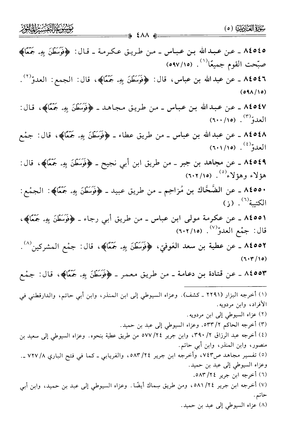 ٨٤٥٥٢ - عن عطية بن سعد العَوفيّ، {فَوَسَطْنَ بِهِ جَمْعًا}، قال: جمْع المشركين (¬٨). (١٥/ ٦٠٣)