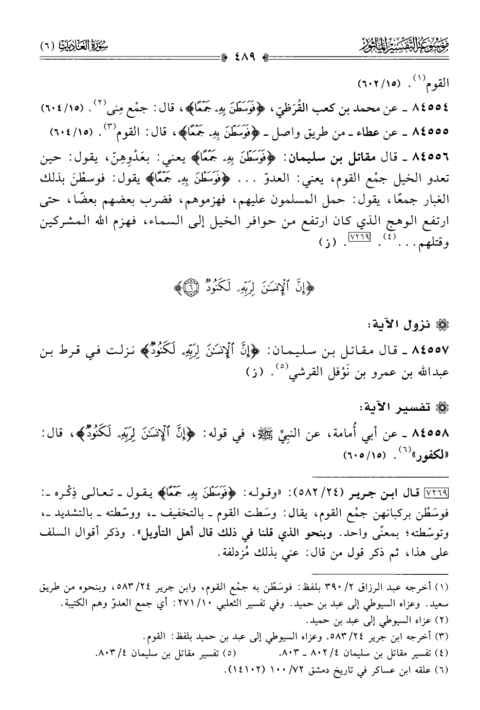 [٧٢٦٩] قال ابنُ جرير (٢٤/ ٥٨٢): «وقوله: {فوسطن به جمعا} يقول -تعالى ذِكْره-: فوسَطْن بركبانهن جمْع القوم، يقال: وسَطت القوم -بالتخفيف-، ووسّطته -بالتشديد-، وتوسّطته؛ بمعنًى واحد. وبنحو الذي قلنا في ذلك قال أهل التأويل». وذكر أقوال السلف على هذا، ثم ذكر قول من قال: عني بذلك مُزدلفة.