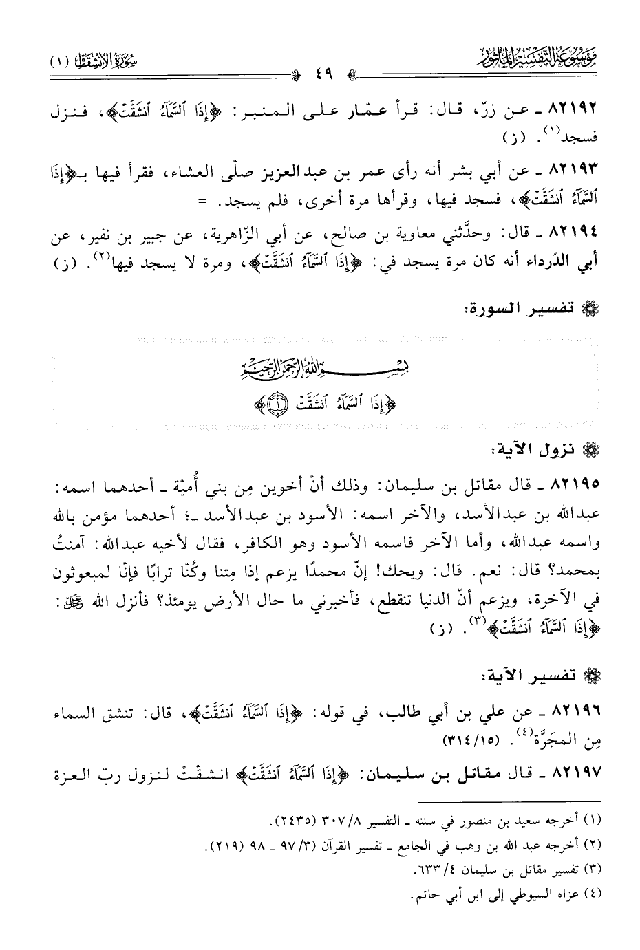 ٨٢١٩٤ - قال: وحدَّثني معاوية بن صالح، عن أبي الزّاهرية، عن جبير بن نفير، عن أبي الدّرداء أنه كان مرة يسجد في: {إذا السَّماءُ انْشَقَّتْ}، ومرة لا يسجد فيها (¬٢). (ز)