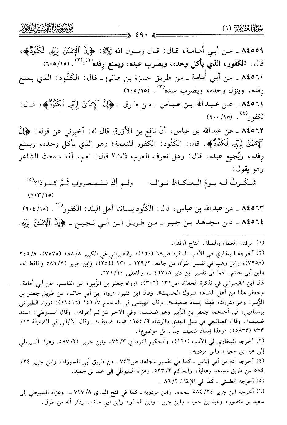 ٨٤٥٦٢ - عن عبد الله بن عباس، أنّ نافع بن الأزرق قال له: أخبِرني عن قوله: {إنَّ الإنْسانَ لِرَبِّهِ لَكَنُودٌ}. قال: الكَنُود: الكفور للنعمة؛ وهو الذي يأكل وحده، ويمنع رِفده، ويُجيع عبده. قال: وهل تعرف العرب ذلك؟ قال: نعم، أما سمعتَ الشاعر وهو يقول: