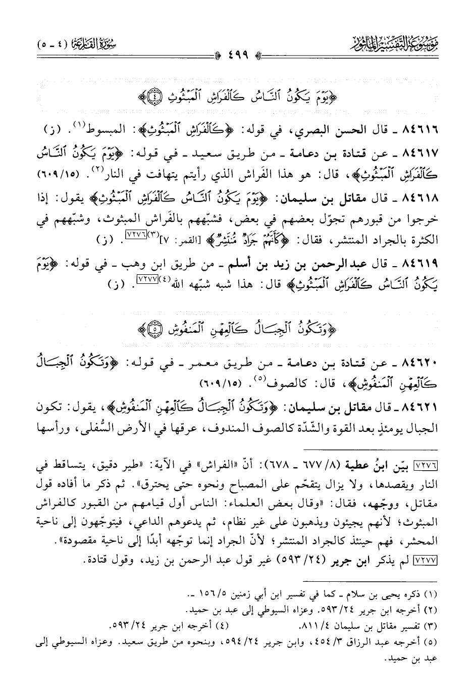 ٨٤٦١٨ - قال مقاتل بن سليمان: {يَوْمَ يَكُونُ النّاسُ كالفَراشِ المَبْثُوثِ} يقول: إذا خرجوا من قبورهم تجوّل بعضهم في بعض، فشبّههم بالفَراش المبثوث، وشبّههم في الكثرة بالجراد المنتشر، فقال: {كَأَنَّهُمْ جَرادٌ مُنْتَشِرٌ} [القمر: ٧] (¬٣) [٧٢٧٦]. (ز)