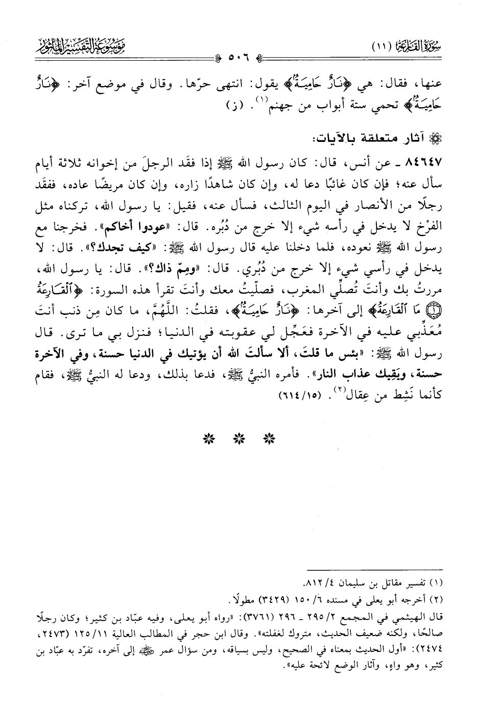٨٤٦٤٧ - عن أنس، قال: كان رسول الله - صلى الله عليه وسلم - إذا فقَد الرجلَ من إخوانه ثلاثة أيام سأل عنه؛ فإن كان غائبًا دعا له، وإن كان شاهدًا زاره، وإن كان مريضًا عاده، ففقَد رجلًا من الأنصار في اليوم الثالث، فسأل عنه، فقيل: يا رسول الله، تركناه مثل الفرْخ لا يدخل في رأسه شيء إلا خرج من دُبُره. قال: «عودوا أخاكم». فخرجنا مع رسول الله - صلى الله عليه وسلم - نعوده، فلما دخلنا عليه قال رسول الله - صلى الله عليه وسلم -: «كيف تجدك؟». قال: لا يدخل في رأسي شيء إلا خرج من دُبُري. قال: «ومِمّ ذاك؟». قال: يا رسول الله، مررتُ بك وأنتَ تُصلِّي المغرب، فصلّيتُ معك وأنتَ تقرأ هذه السورة: {القارِعَةُ ما القارِعَةُ} إلى آخرها: {نارٌ حامِيَةٌ}، فقلتُ: اللهم، ما كان مِن ذنب أنتَ مُعَذِّبي عليه في الآخرة فعَجِّل لي عقوبته في الدنيا؛ فنزل بي ما ترى. قال رسول الله - صلى الله عليه وسلم -: «بئس ما قلتَ، ألا سألتَ الله أن يؤتيك في الدنيا حسنة، وفي الآخرة حسنة، ويَقِيك عذاب النار». فأمره النبيُّ - صلى الله عليه وسلم -، فدعا بذلك، ودعا له النبيُّ - صلى الله عليه وسلم -، فقام كأنما نَشِط من عِقال (¬٢). (١٥/ ٦١٤)