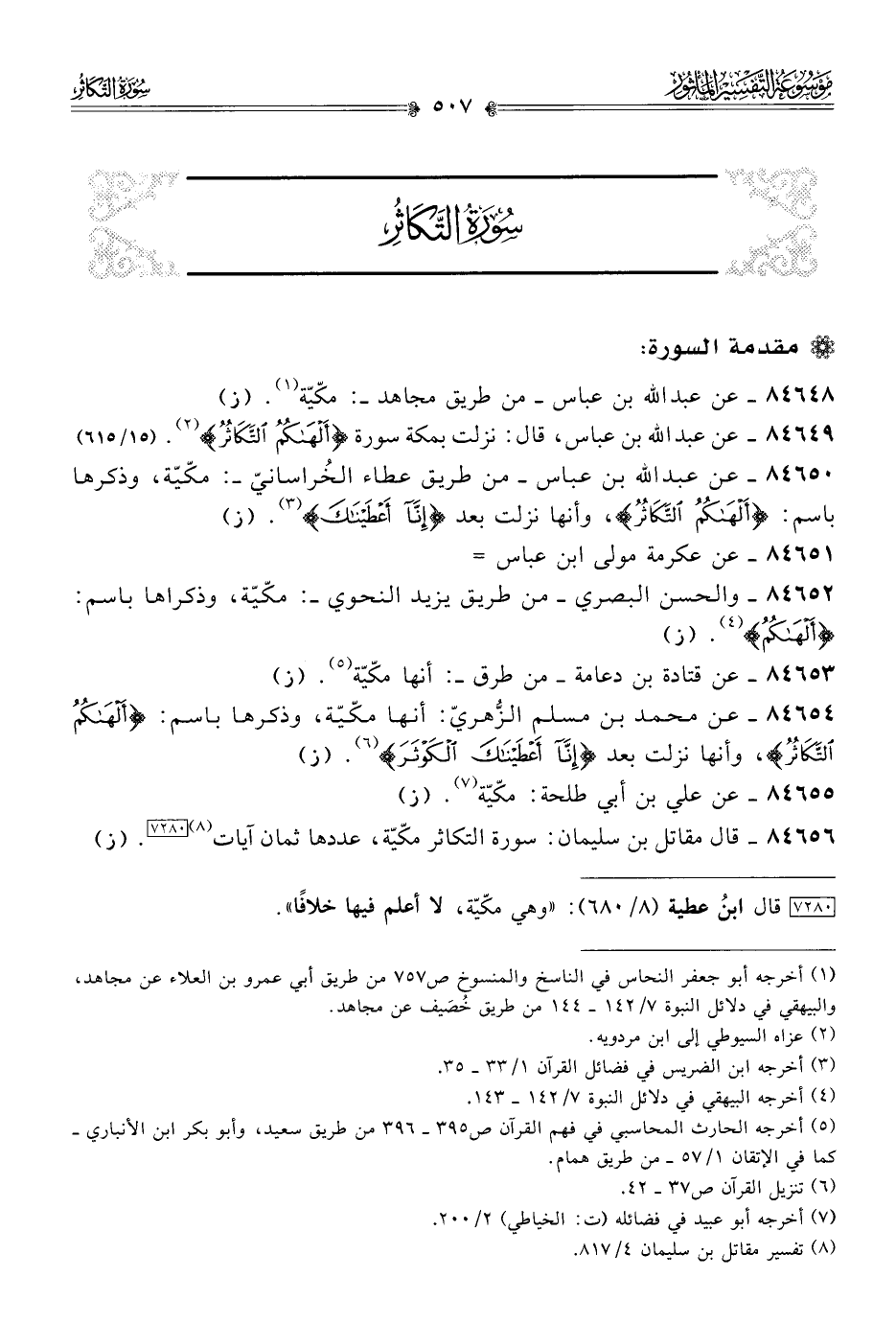 ٨٤٦٥٠ - عن عبد الله بن عباس -من طريق عطاء الخُراسانيّ-: مكّيّة، وذكرها بمسمّى: {ألهاكم التكاثر}، وأنها نزلت بعد {إنا أعطيناك} (¬٣). (ز)