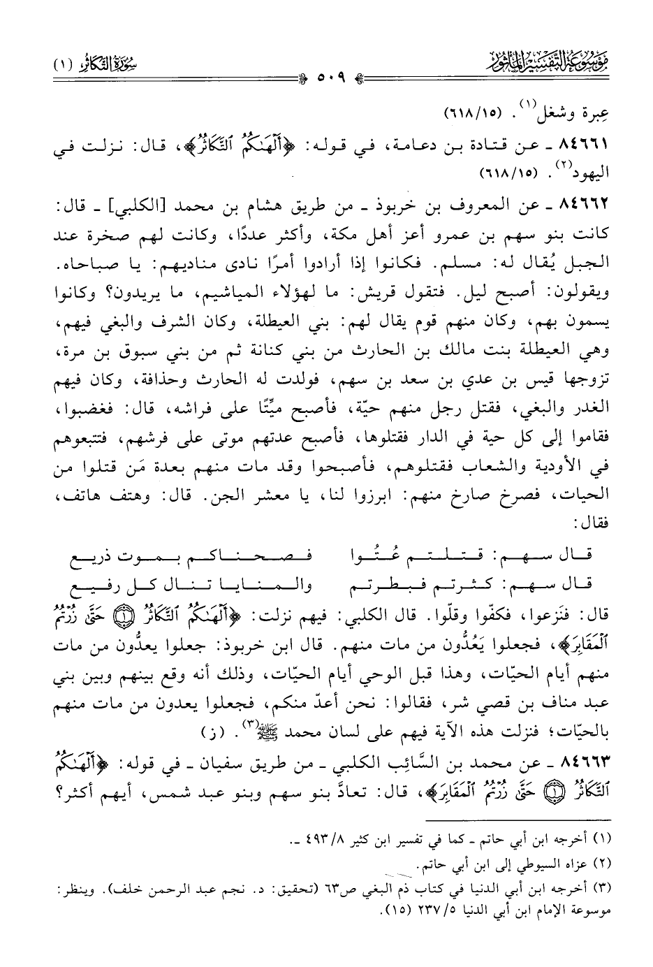 ٨٤٦٦٣ - عن محمد بن السّائِب الكلبي -من طريق سفيان- في قوله: {ألهاكم التكاثر حتى زرتم المقابر}، قال: تعادَّ بنو سهم وبنو عبد شمس، أيهم أكثر؟