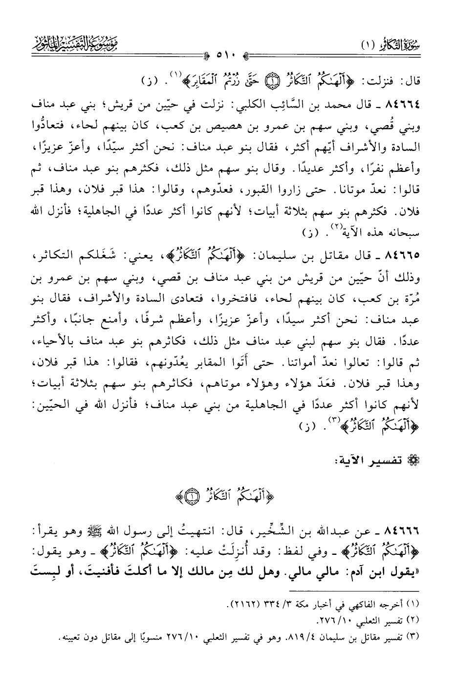 ٨٤٦٦٥ - قال مقاتل بن سليمان: {ألْهاكُمُ التَّكاثُرُ}، يعني: شَغَلكم التكاثر، وذلك أنّ حيّين من قريش من بني عبد مناف بن قصي، وبني سهم بن عمرو بن مُرّة بن كعب، كان بينهم لحاء، فافتخروا، فتعادى السادة والأشراف، فقال بنو عبد مناف: نحن أكثر سيدًا، وأعزّ عزيزًا، وأعظم شرفًا، وأمنع جانبًا، وأكثر عددًا. فقال بنو سهم لبني عبد مناف مثل ذلك، فكاثرهم بنو عبد مناف بالأحياء، ثم قالوا: تعالوا نعدّ أمواتنا. حتى أتَوا المقابر يعُدّونهم، فقالوا: هذا قبر فلان، وهذا قبر فلان. فعَدّ هؤلاء وهؤلاء موتاهم، فكاثرهم بنو سهم بثلاثة أبيات؛ لأنهم كانوا أكثر عددًا في الجاهلية من بني عبد مناف؛ فأنزل الله في الحيّين: {ألْهاكُمُ التَّكاثُرُ} (¬٣). (ز)