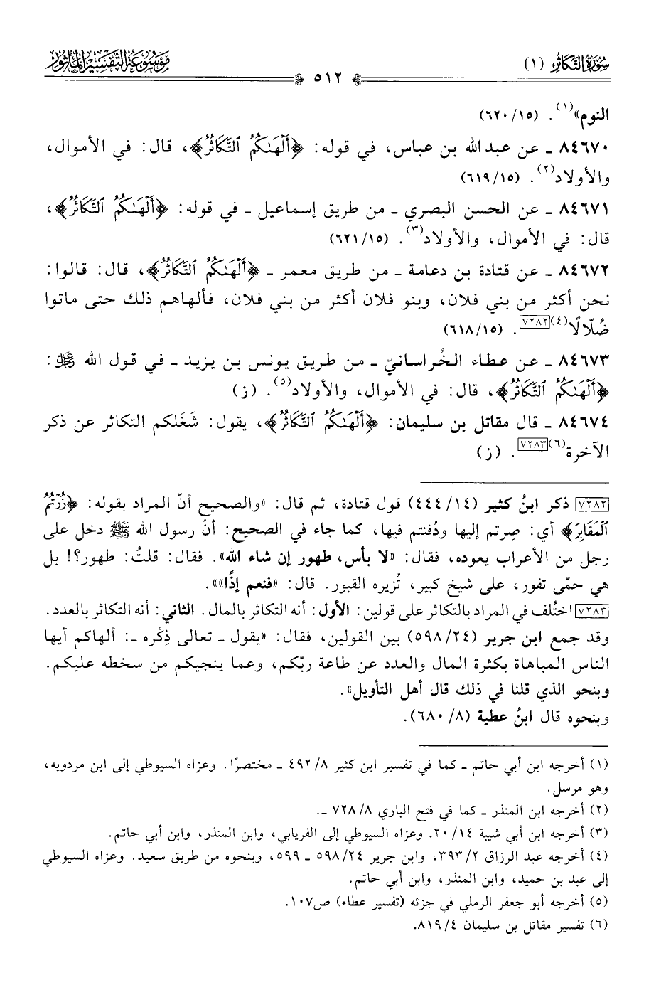 ٨٤٦٧٠ - عن عبد الله بن عباس، في قوله: {ألْهاكُمُ التَّكاثُرُ}، قال: في الأموال، والأولاد (¬٢). (١٥/ ٦١٩)