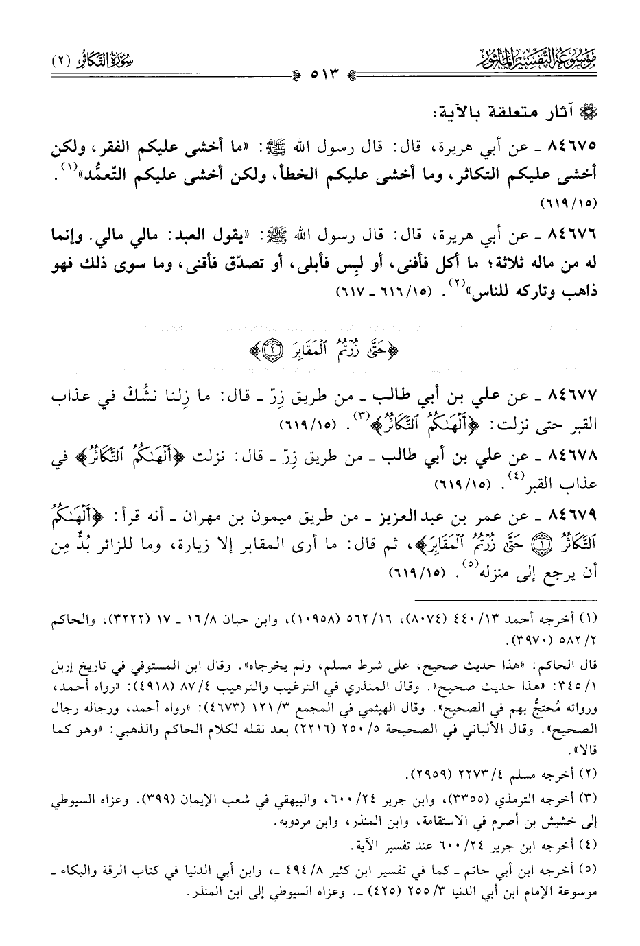 ٨٤٦٧٨ - عن علي بن أبي طالب -من طريق زِرّ- قال: نزلت {ألْهاكُمُ التَّكاثُرُ} في عذاب القبر (¬٤). (١٥/ ٦١٩)
