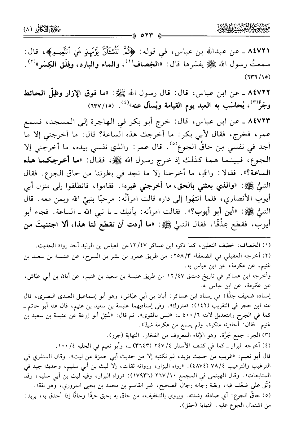 ٨٤٧٢٢ - عن ابن عباس، قال: قال رسول الله - صلى الله عليه وسلم -: «ما فوق الإزار وظِلّ الحائط وجَرٍّ (¬٣)، يُحاسَب به العبد يوم القيامة ويُسأل عنه» (¬٤). (١٥/ ٦٣٧)