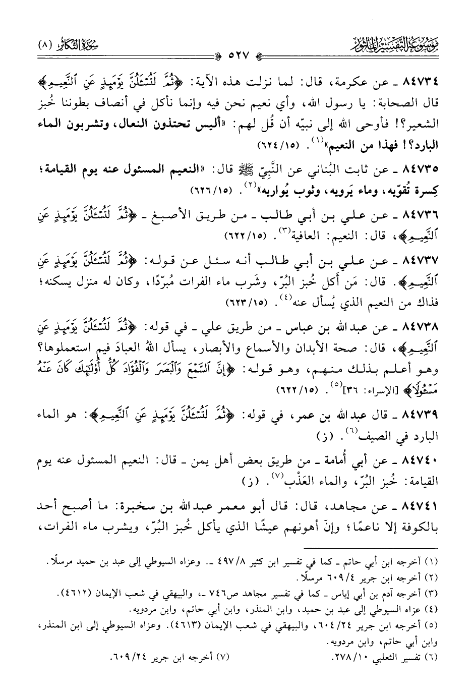 ٨٤٧٣٤ - عن عكرمة، قال: لما نزلت هذه الآية: {ثُمَّ لَتُسْأَلُنَّ يَوْمَئِذٍ عَنِ النَّعِيمِ} قال الصحابة: يا رسول الله، وأي نعيم نحن فيه وإنما نأكل في أنصاف بطوننا خُبز الشعير؟! فأوحى الله إلى نبيّه أن قُل لهم: «أليس تحتذون النعال، وتشربون الماء البارد؟! فهذا من النعيم» (¬١). (١٥/ ٦٢٤)