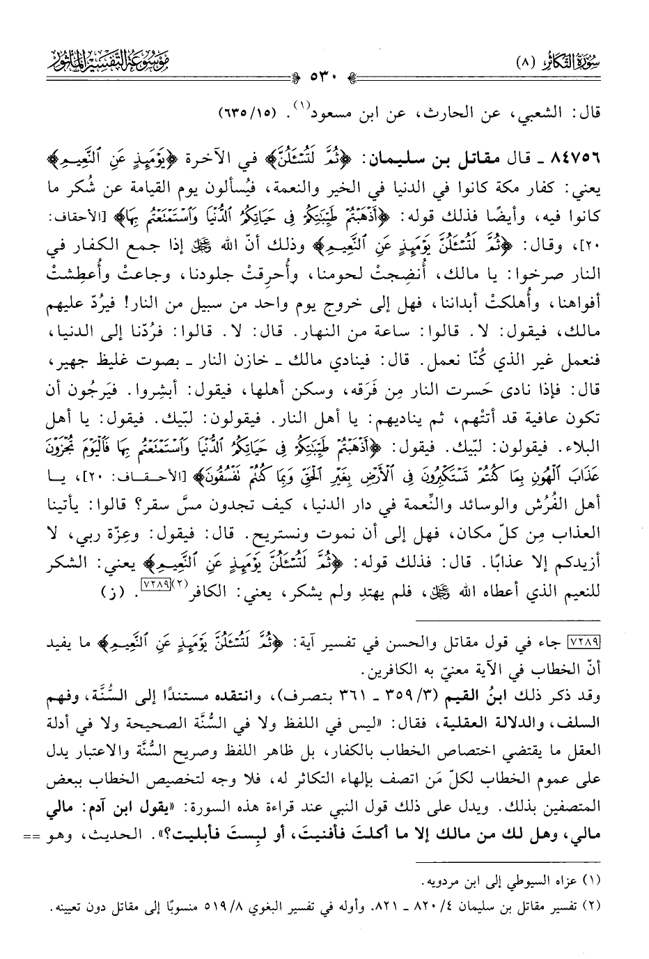 وقد ذكر ذلك ابنُ القيم (٣/ ٣٥٩ - ٣٦١ بتصرف)، وانتقده مستندًا إلى السنة، وفهم السلف، والدلالة العقلية، فقال: «ليس في اللفظ ولا في السنة الصحيحة ولا في أدلة العقل ما يقتضى اختصاص الخطاب بالكفار، بل ظاهر اللفظ وصريح السنة والاعتبار يدل على عموم الخطاب لكلّ مَن اتصف بإلهاء التكاثر له، فلا وجه لتخصيص الخطاب ببعض المتصفين بذلك. ويدل على ذلك قول النبى عند قراءة هذه السورة: «يقول ابن آدم: مالي مالي، وهل لك من مالك إلا ما أكلتَ فأفنيتَ، أو لبِستَ فأبليت؟». الحديث، وهو في صحيح مسلم. وقائل ذلك قد يكون مسلمًا، وقد يكون كافرًا، ويدل عليه أيضًا الأحاديث التى تقدّمتْ، وسؤال الصحابة النبي، وفهْمهم العموم، حتى قالوا له: وأي نعيم نُسأل عنه، وإنما هو الأسوَدان؟! فلو كان الخطاب مختصًّا بالكفار لبيَّن لهم ذلك، وقال: ما لكم ولها إنما هي للكفار، فالصحابة فهموا التعميم، والأحاديث صريحة في التعميم، والذى أُنزل عليه القرآن أقرّهم على فهم العموم ... وأيضًا فالواقع يشهد بعدم اختصاصه، وأنّ الإلهاء بالتكاثر واقع من المسلمين كثيرًا، بل أكثرهم قد ألهاه التكاثر، وخطاب القرآن عام لمن بلغه، وإن كان أول مَن دخل فيه المعاصرين لرسول الله فهو متناول لمن بعدهم، وهذا معلوم بضرورة الدين وإن نازع فيه من لا يُعتدّ بقوله من المتأخرين». وذكر أنّ حديث أبي بكر -الوارد في المتن من رواية ابن مسعود في آخره: «المؤمن لا يثرب عليه ... » - والمفيد تخصيص السؤال بالكافرين ضعيف لا يُحتجُّ به، ومع ضعفه عارضه حديث آخر لأبي بكر -وهو الوارد في المتن قبله من رواية أبي هريرة- والمفيد عموم السؤال عن النعيم لجميع الناس.
