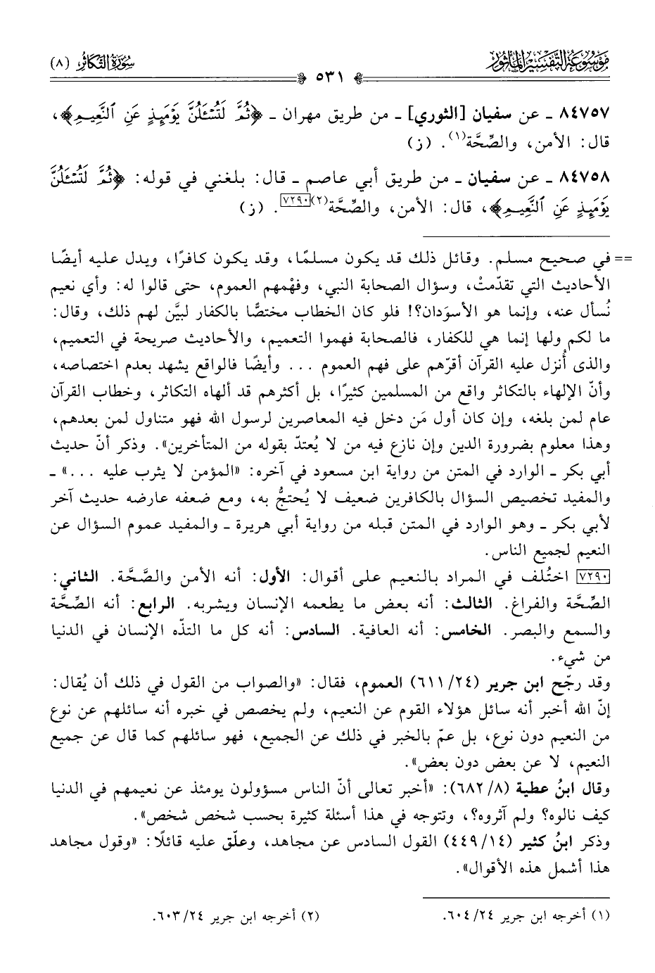 ٨٤٧٥٧ - عن سفيان [الثوري]-من طريق مهران- {ثُمَّ لَتُسْأَلُنَّ يَوْمَئِذٍ عَنِ النَّعِيمِ}، قال: الأمن، والصِّحَّة (¬١). (ز)