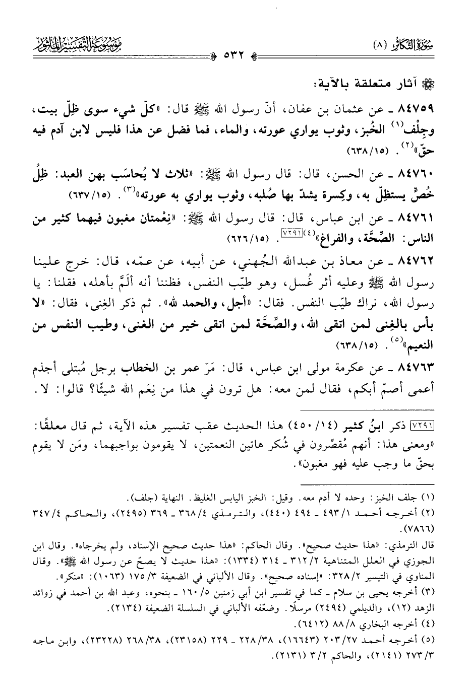 [٧٢٩١] ذكر ابنُ كثير (١٤/ ٤٥٠) هذا الحديث عقب تفسير هذه الآية، ثم قال معلقًا: «ومعنى هذا: أنهم مُقصِّرون في شُكر هاتين النعمتين، لا يقومون بواجبهما، ومَن لا يقوم بحقّ ما وجب عليه فهو مغبون».