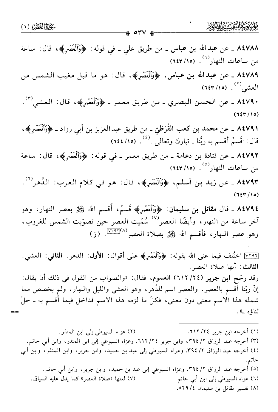 ٨٤٧٩١ - عن محمد بن كعب القُرَظيّ -من طريق عبد العزيز بن أبي رواد- {والعَصْرِ}، قال: قَسمٌ أقسم به ربُّنا -وتبارك وتعالى- (¬٤). (١٥/ ٦٤٤)